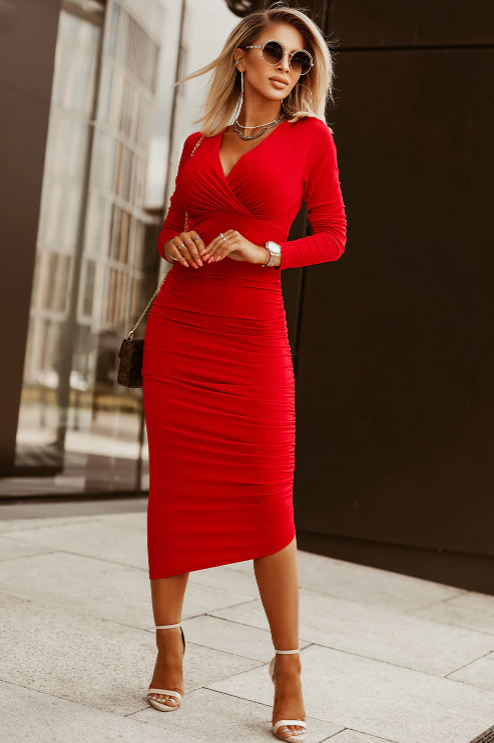 Fiery Red Long Sleeves Wrap V Neck Ruched Sheath Midi Dress