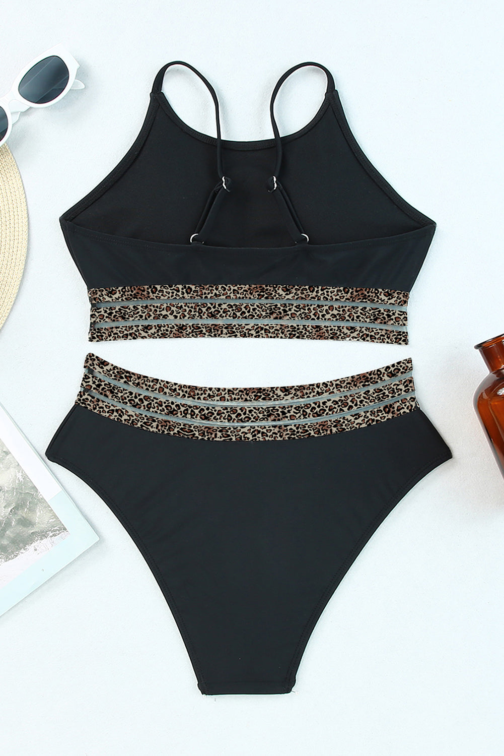 - Athletic two-piece bikini set characterized by leopard mesh trim