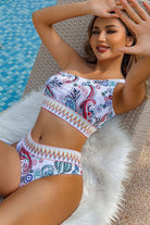 White Boho Paisley Contrast Trimmed One-shoulder Bikini