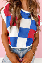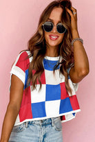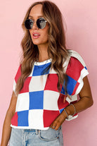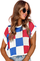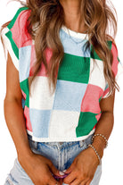 Grapefruit Orange Checkered Color Block Cap Sleeve Knitted Top
