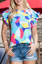 Multicolor Abstract Print Ruffle Sleeve Casual Blouse for Women