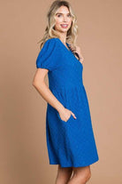 The Texture Round Neck Short Sleeve Dress with Pockets is a versatile and comfortable piece that is perfect for any occasion. Made from a textured fabric, it adds depth and visual interest to the overall look. The round neck and short sleeves provide a classic and timeless style, while the inclusion of pockets adds functionality and convenience. Whether worn casually with sneakers or dressed up with heels, this dress is effortlessly chic and can be easily accessorized for a variety of looks. The relaxed fit and comfortable fabric make it suitable for all-day wear, allowing you to move with ease and confidence. A must-have addition to your wardrobe, the Texture Round Neck Short Sleeve Dress with Pockets is a stylish and practical choice.