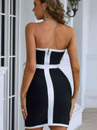 Make a statement with our Contrast Strapless Bow Detail Mini Dress, a perfect blend of romantic and sexy styles. This cocktail dress features an asymmetrical neck, two-tone pattern, and a charming bow detail, adding a touch of sophistication to your wardrobe.