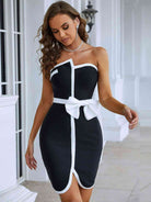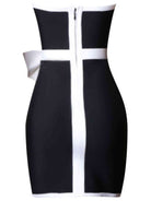 This mini dress is designed for those who want to make a lasting impression. The highly stretchy material ensures a comfortable fit, while the unique design elements set you apart from the crowd. Add this Contrast Strapless Bow Detail Mini Dress to your collection for a fashion-forward look.
