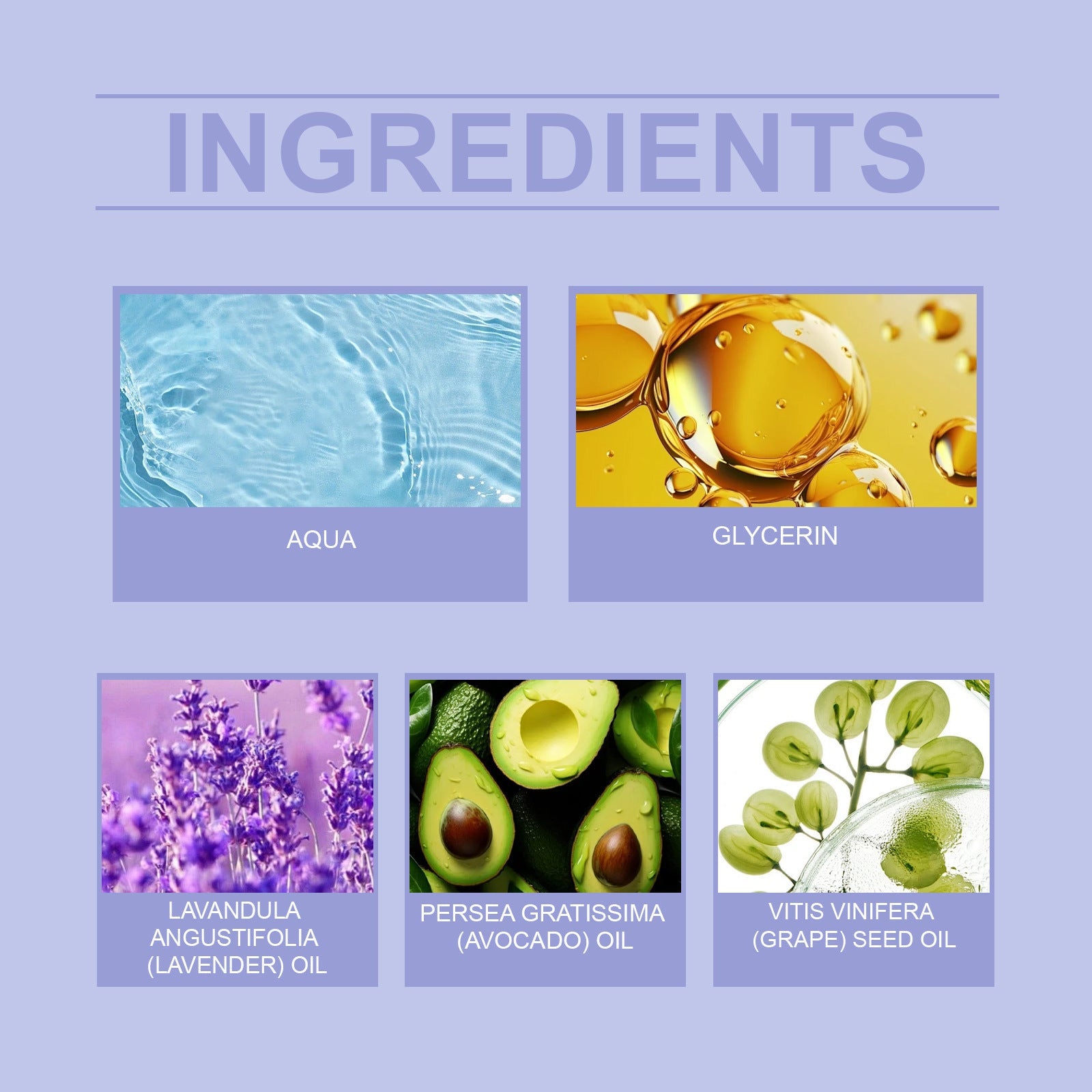 Ingredients: Water, glycerin, lavender oil, avocado oil, grape seed oil