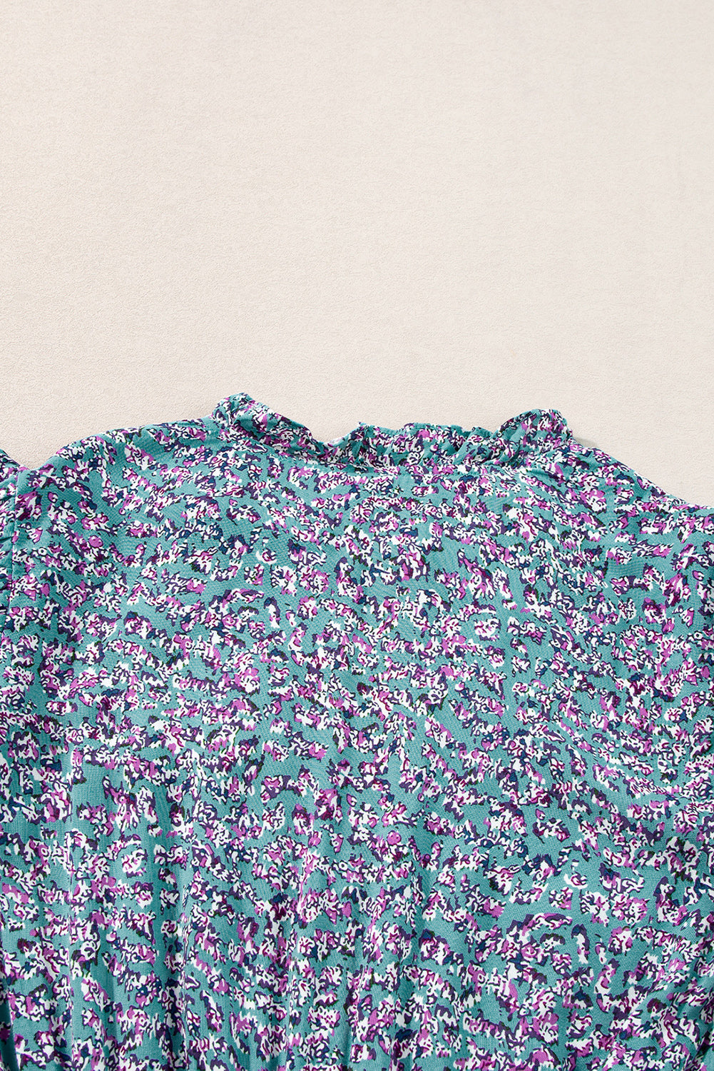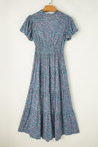 Blue Printed V Neck Shirred Short Puff Sleeve Maxi Dress