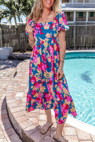 Dark Blue Square Neck Bubble Sleeve Ruffled Floral Dress