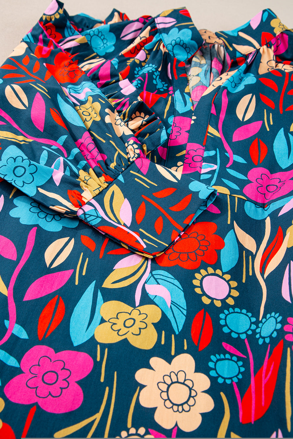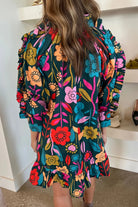Green Floral Print Puff Sleeve Ruffled Mini Dress