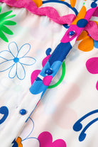 Buttoned bodice, drawstring waist, and ruffle flared skirt finished