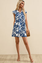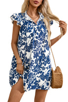 Sail Blue Floral Ruffled Cap Sleeve Tied Neck Mini Dress