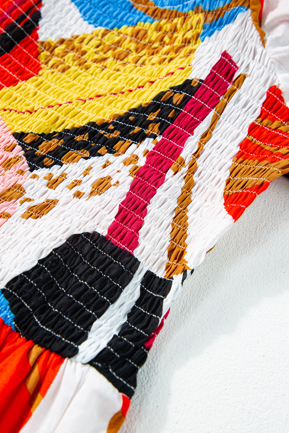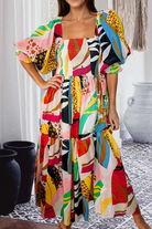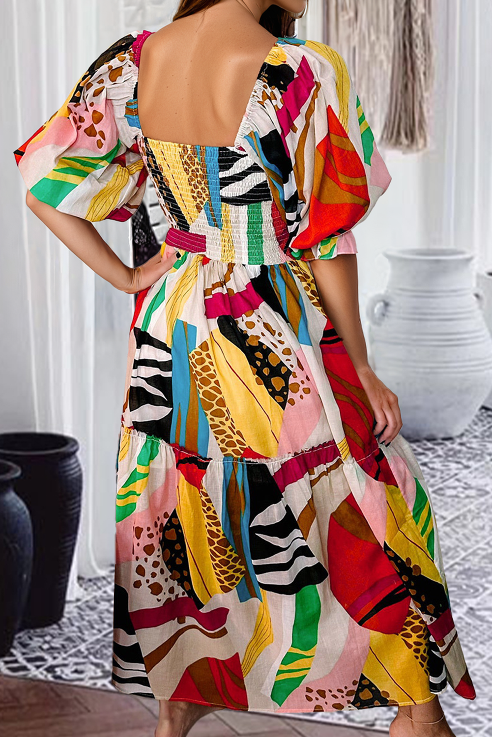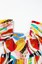 White Square Neck Smocked Abstract Print Boho Maxi Dress