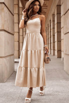 Oatmeal Crossover Backless Bodice Tiered Maxi Dress