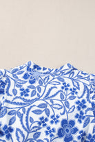 Blue Flower Print Puff Sleeve Tiered Dress