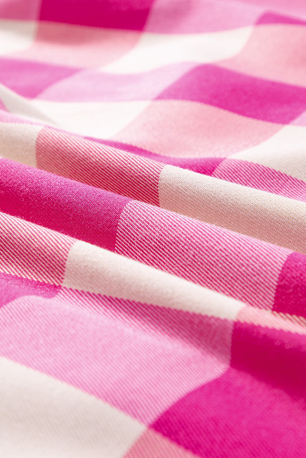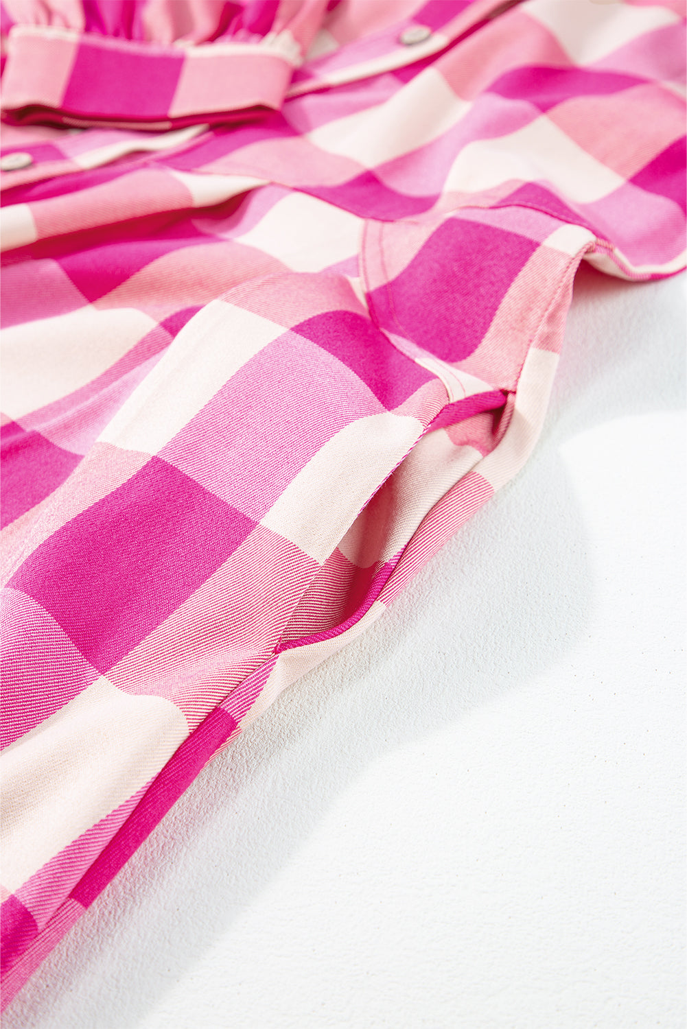 Rose Red Plaid Collared Bracelet Sleeve Shirt Flare Mini Dress