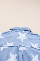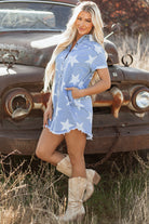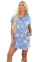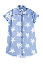 Sky Blue Stars Frayed Hem Collared Short Sleeve Denim Dress