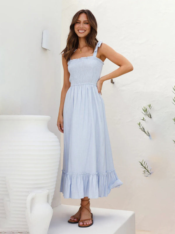 The long dress is designed with solid-color shoulder straps as suspenders, without any decorative patterns or patterns, making it simple and elegant. The solid color design makes the long dress more versatile and can be matched with various accessories and shoes to show different styles.
