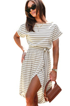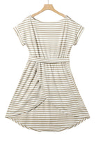 Khaki Stripe Short Sleeve Belted Wrapped Hemline T-Shirt Dress