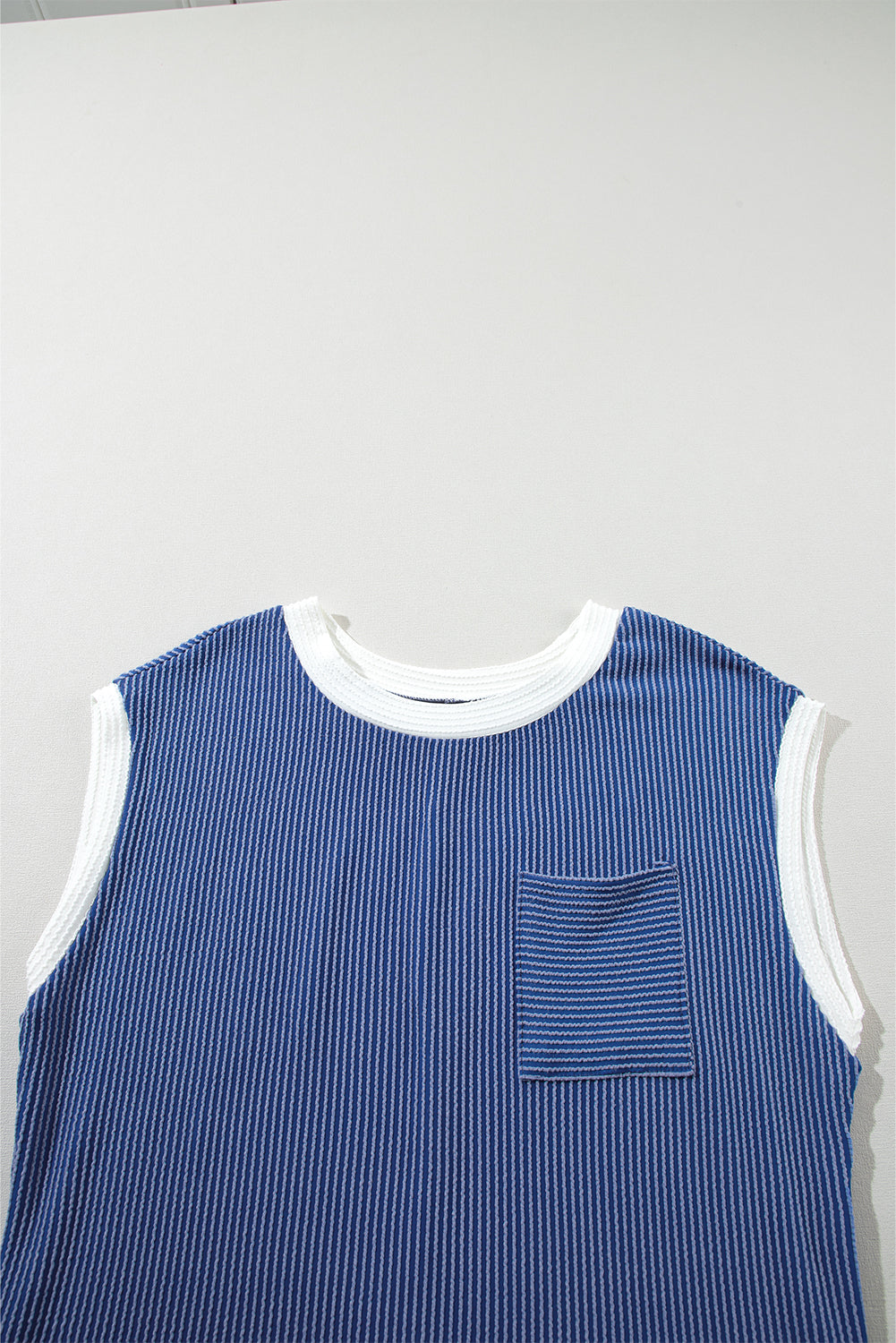 The contrast round neck and sleeve edge create a color block effect