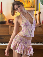 New sexy fashionable halterneck V-neck halter top floral skirt two-piece set