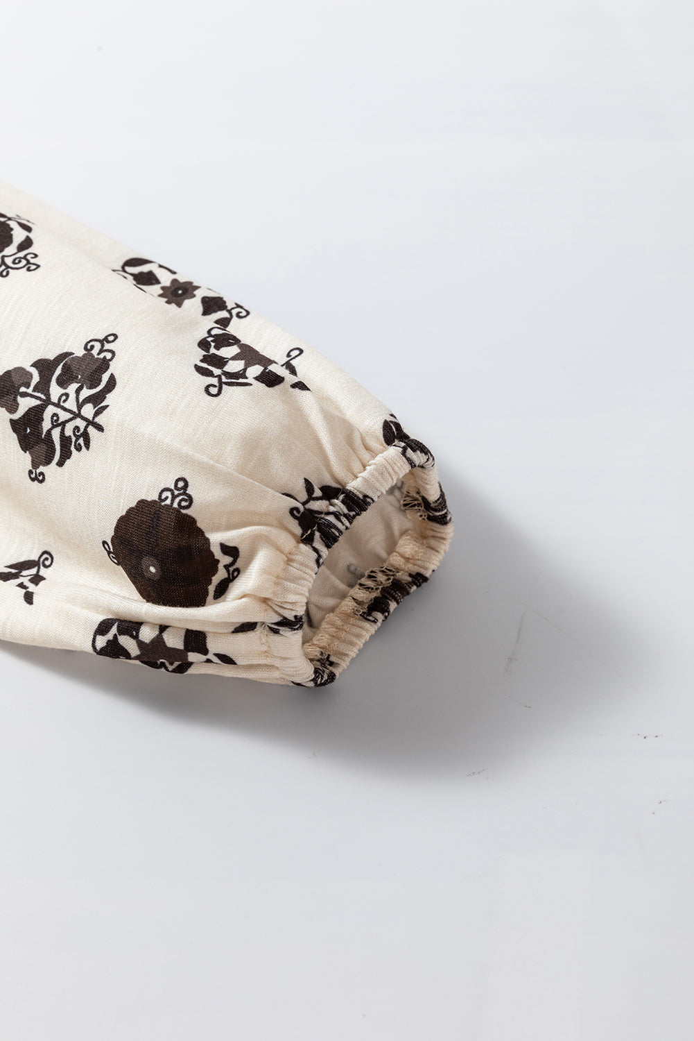 White Printed Split Neck Bubble Sleeve Loose Blouse