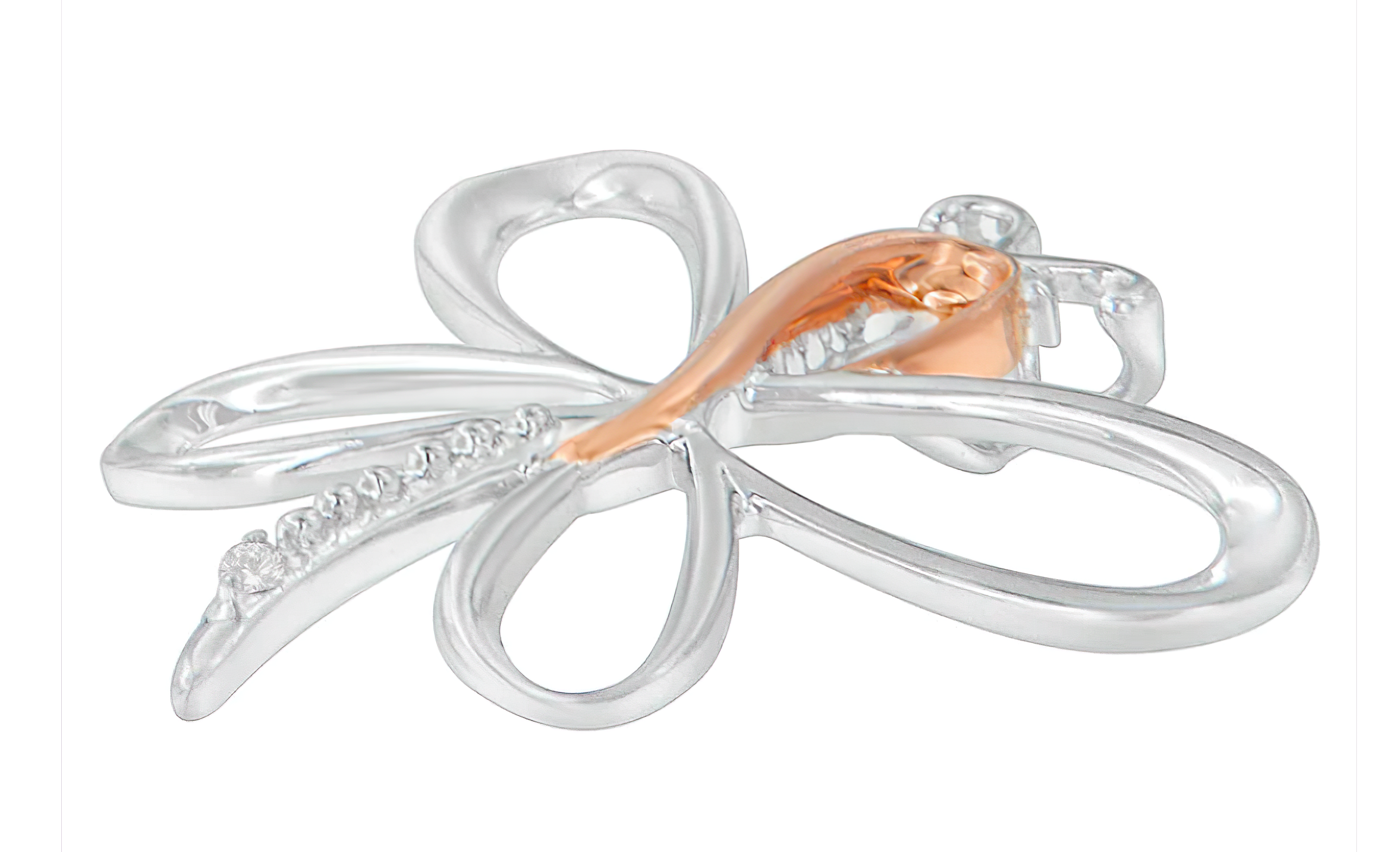 This stunning two-tone 10K rose gold and sterling silver pendant necklace features a dragonfly shaped pendant with a 10K rose gold coated thorax and silver wings and abdomen with a single diamond accenting the end of its tail. The stunning pendant comes with a matching box chain necklace with a spring ring clasp. The contemporary yet classic 18" box chain complements any neckline beautifully. This authentic design is crafted of real 92.5% sterling silver that has been electro-coated with genuine 10K gold, ensuring it will keep a tarnish-free shine for years to come. Show off your unique style with this diamond dragonfly pendant necklace. It's a classic and feminine piece she'll want to show off every day. Whether worn for daytime glamour or evening sparkle, this necklace is gorgeously versatile.