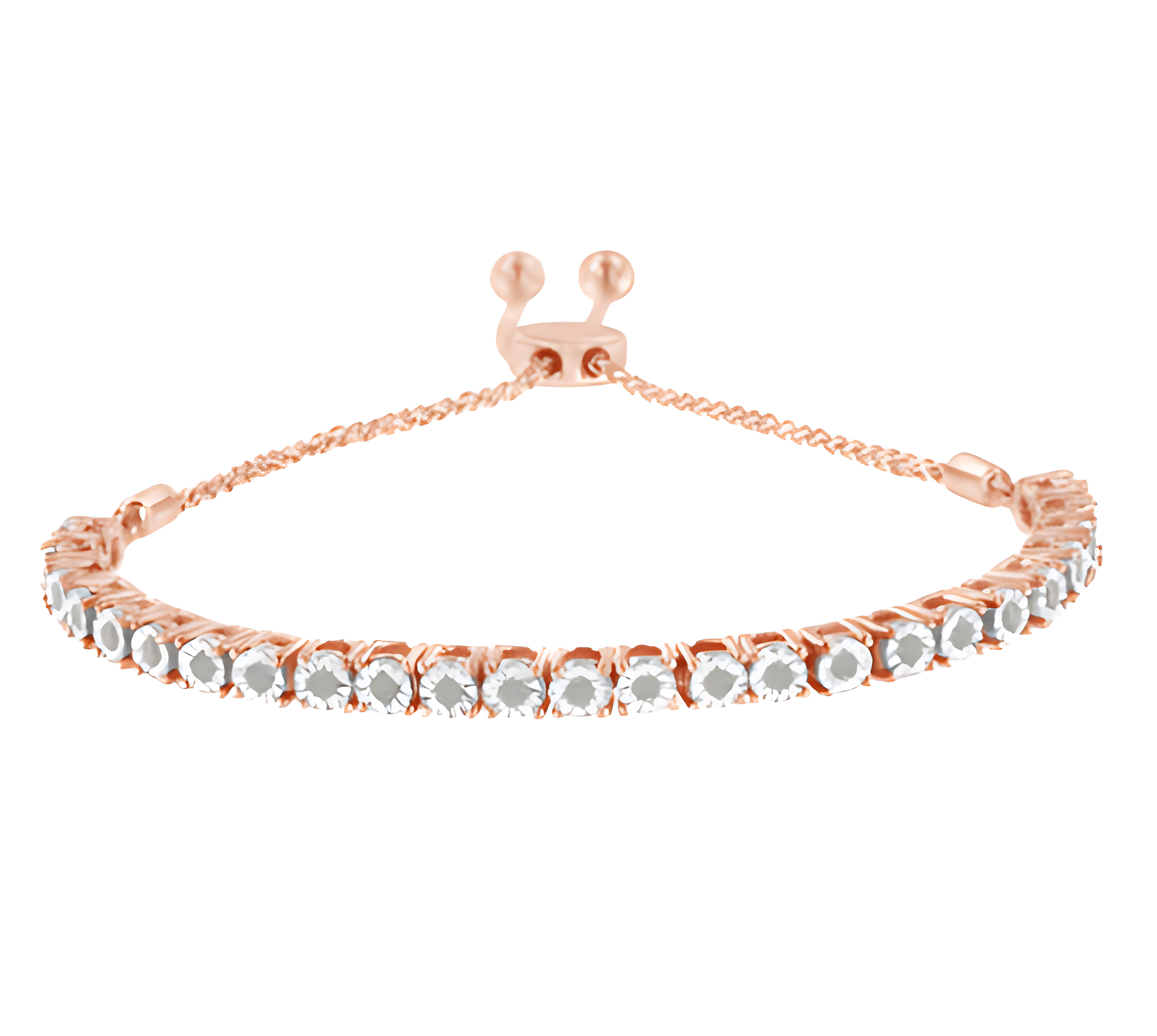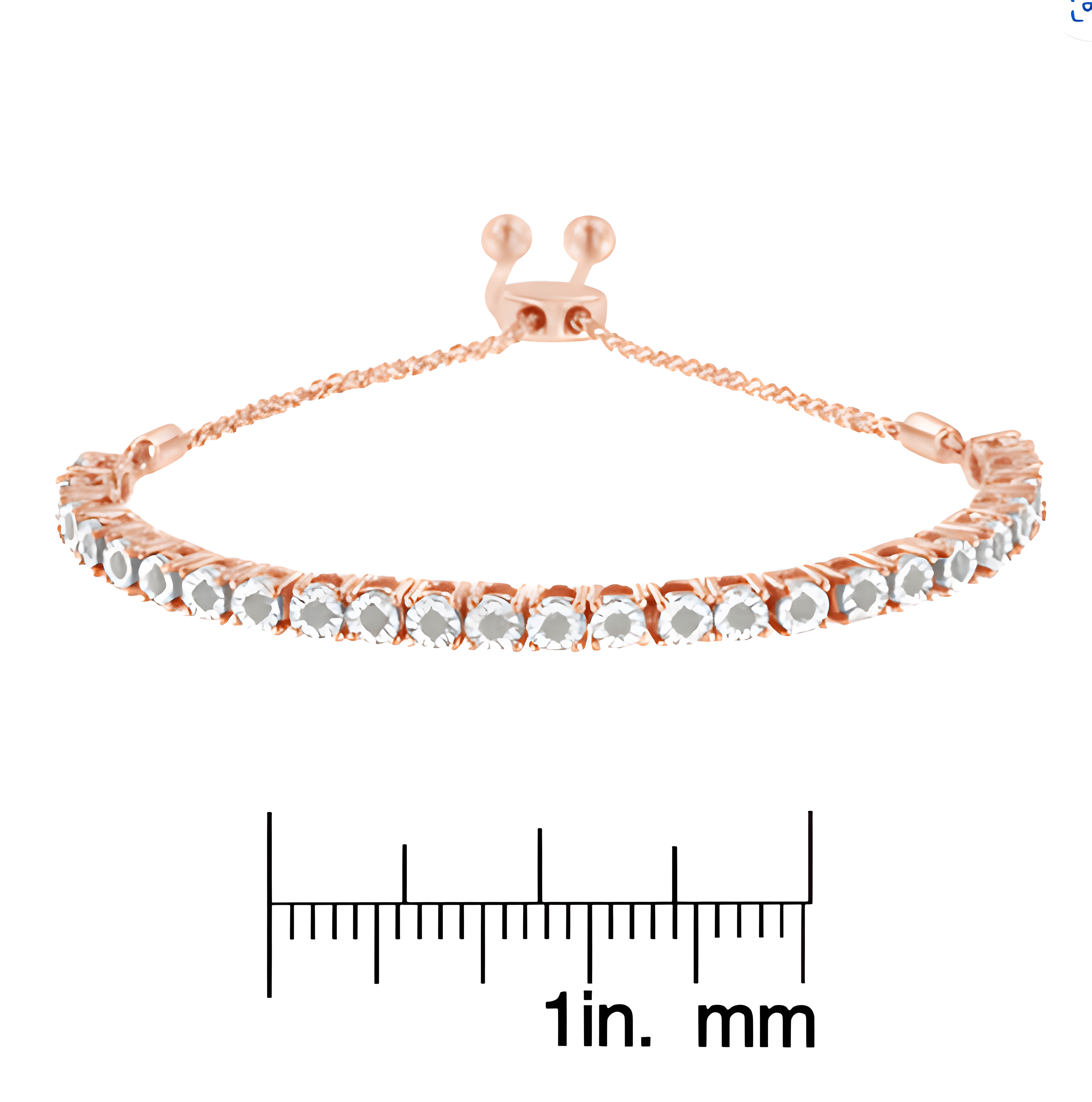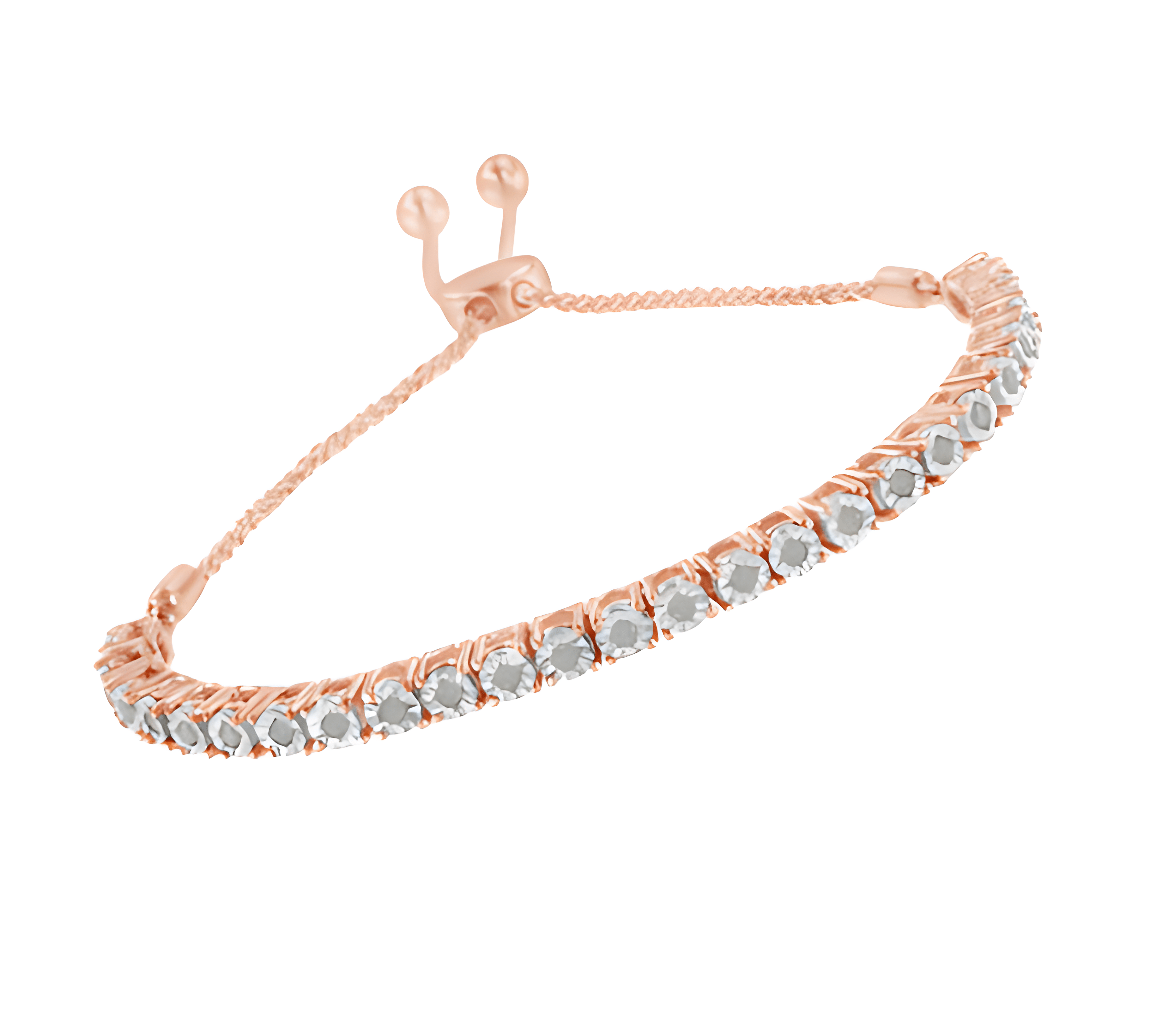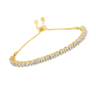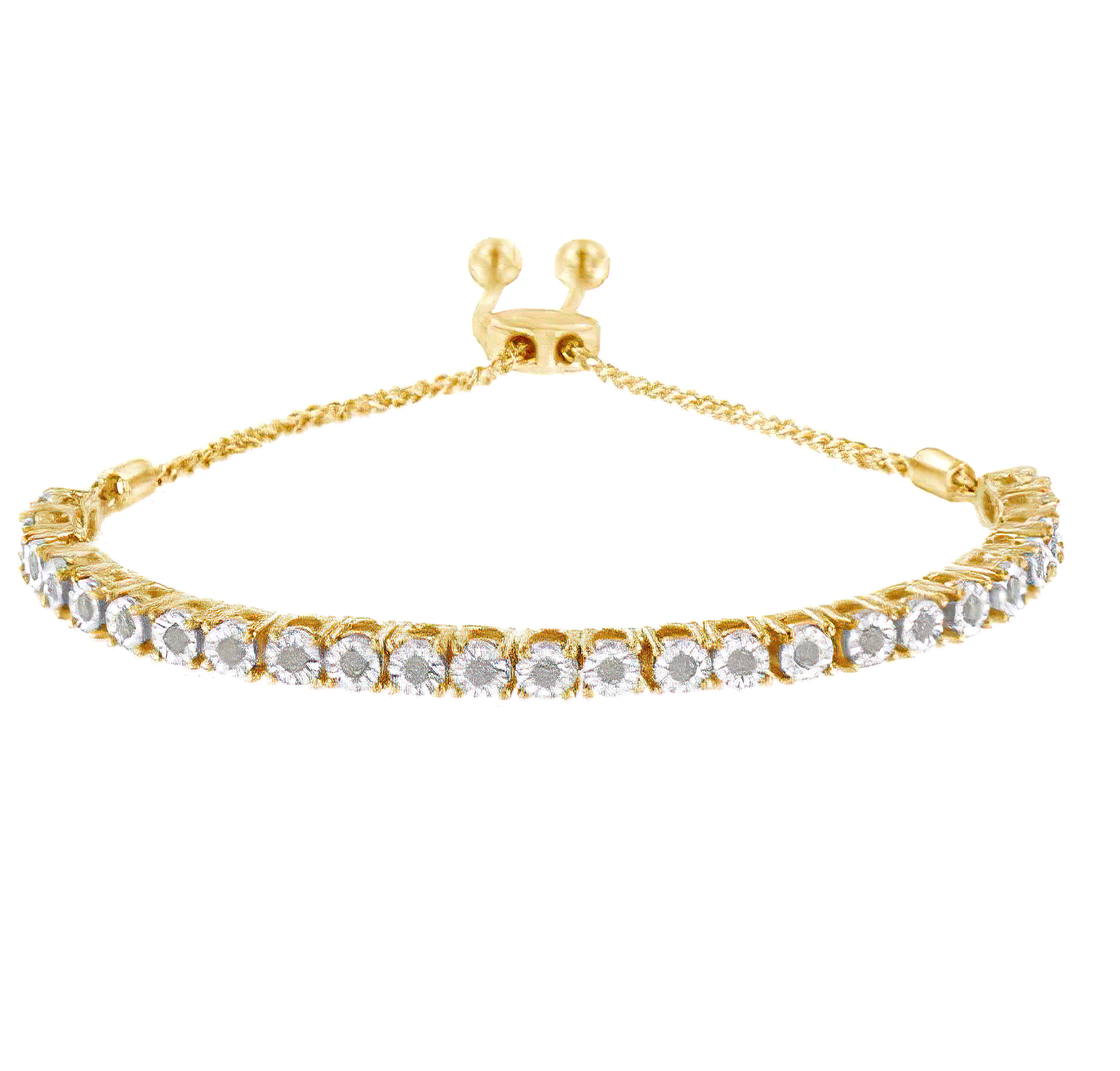 Elegant and timeless, this gorgeous .925 sterling silver bracelet features dainty miracle set rose-cut, promo quality diamonds, which are milky and cloudy in nature. The unique miracle-plate setting centers each genuine diamond in a mirror-finish, high-polish frame, giving the illusion of a much larger stone. Each miracle setting is held in a four prong setting. The row of links are sandwiched between two lengths of wheat chain. The bracelet features a secure slider that allows this bracelet to adjust from 4”-10”. This authentic design comes in real 92.5% sterling silver that has been electro-coated 10K yellow gold coated sterling silver, a precious metal that will keep a tarnish-free shine for years to come. This sweet lariat style bracelet makes a perfect gift for any occasion. It's a classic and feminine piece she'll want to show off every day.