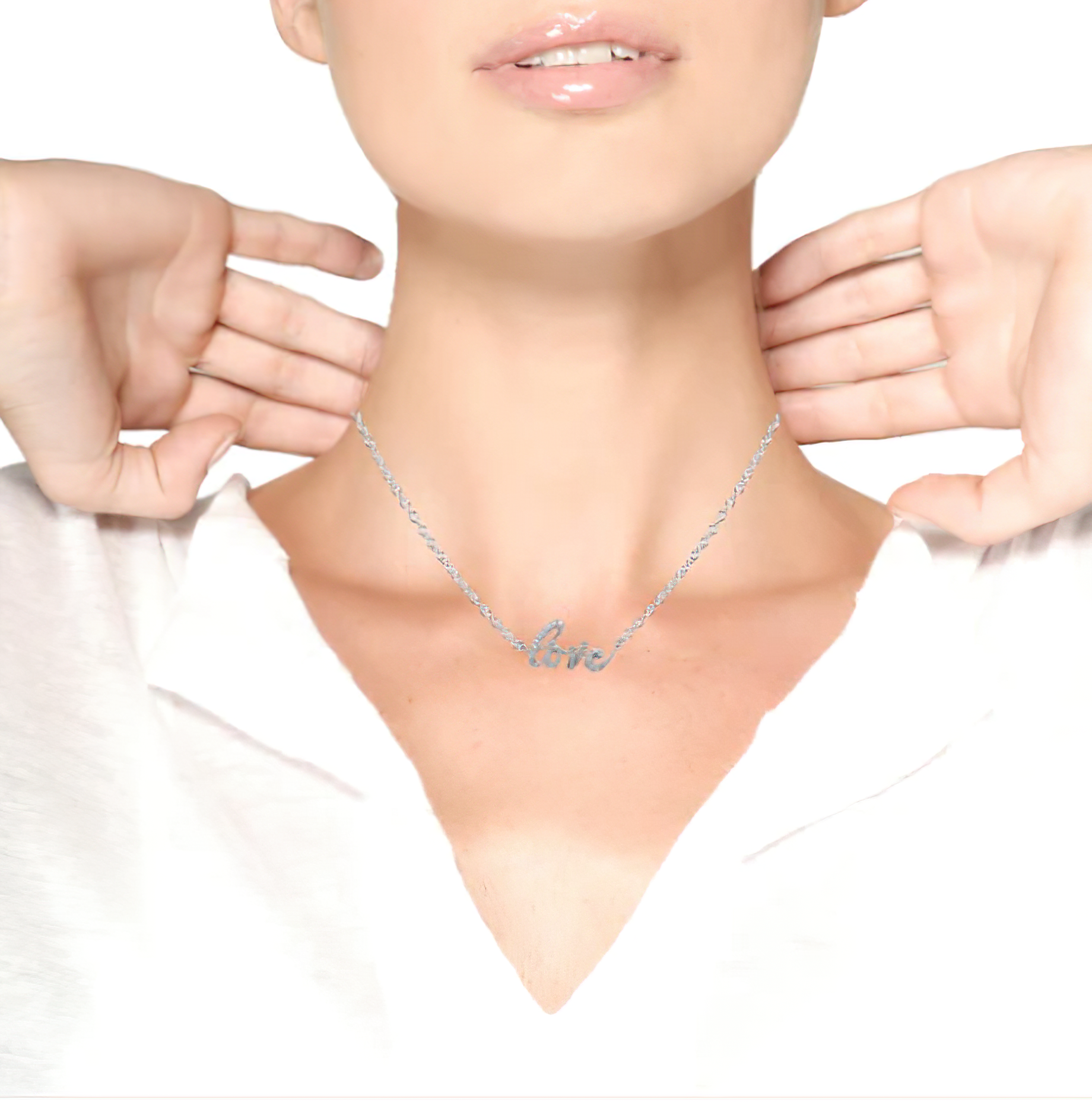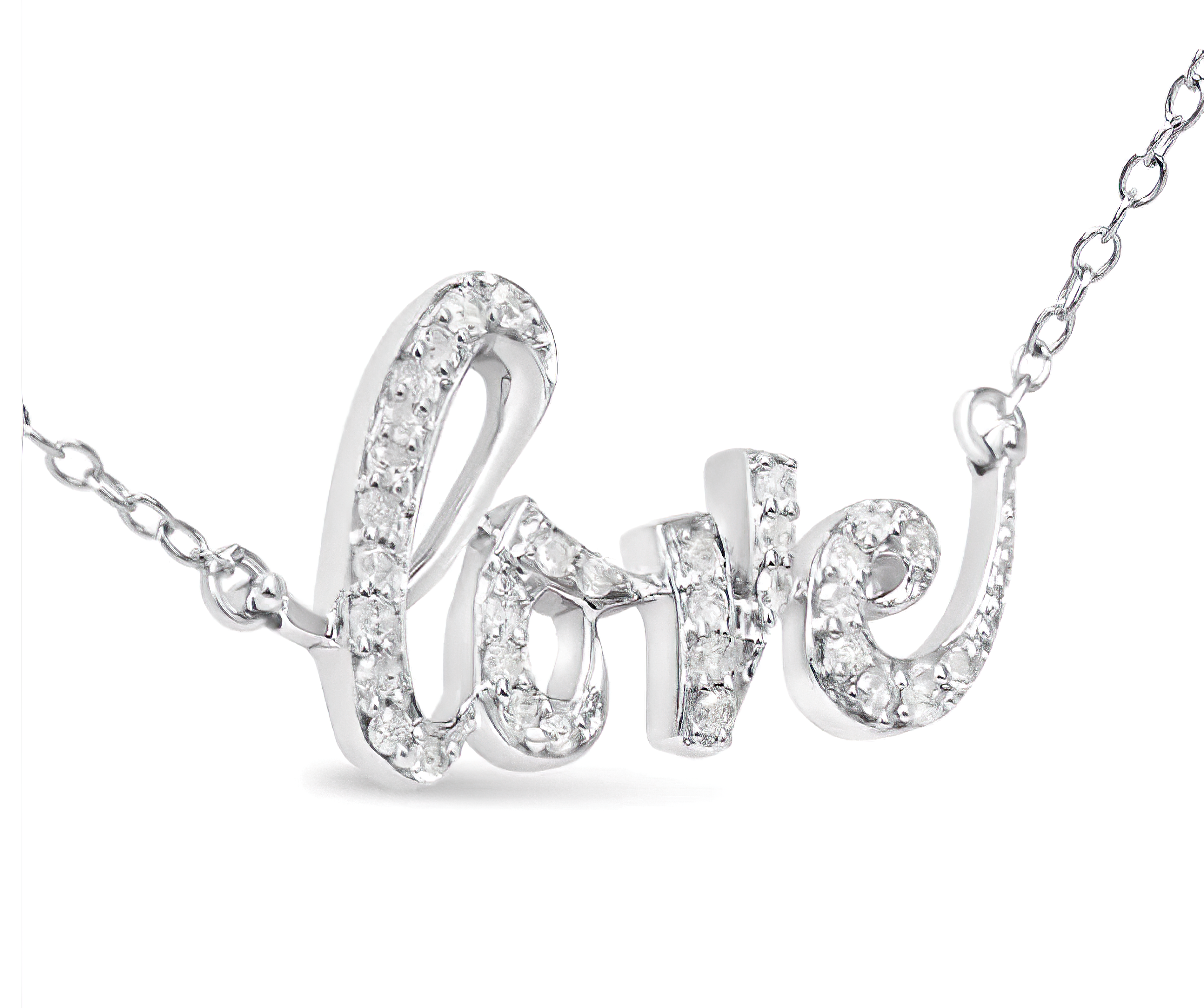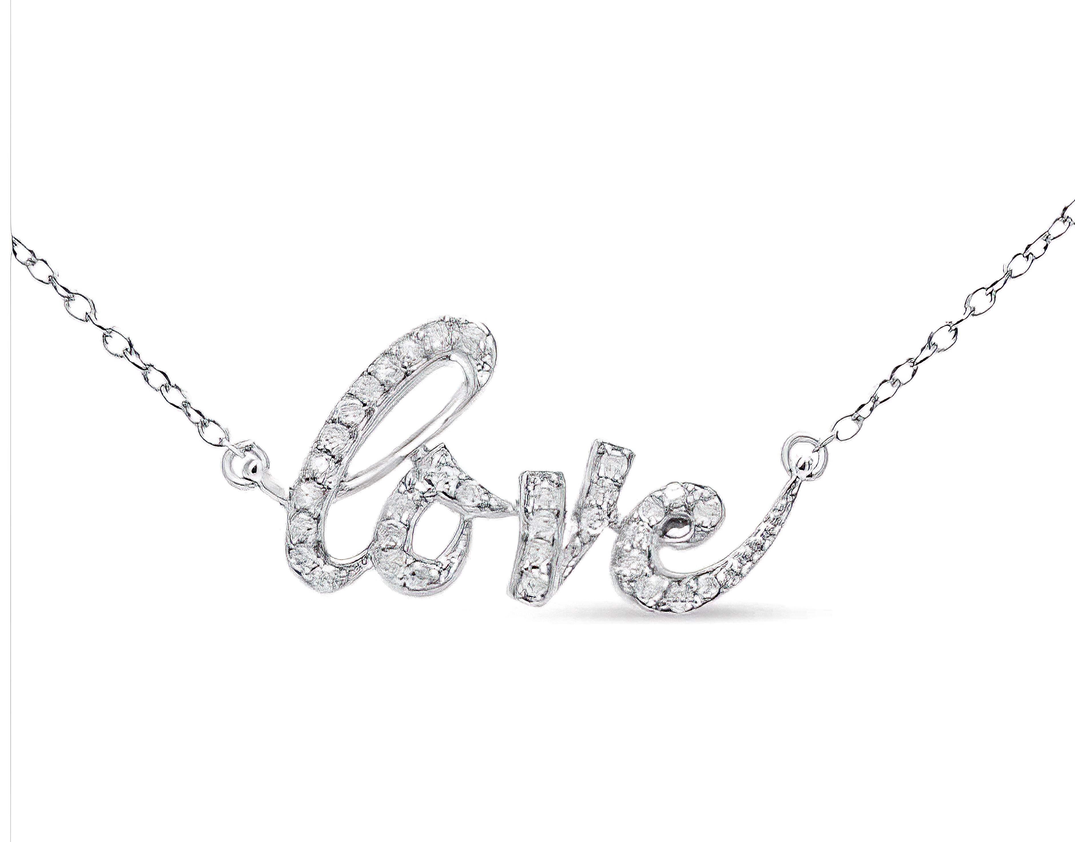 Prepare to captivate hearts with our exquisite "Love" pendant necklace, a stunning declaration of devotion in shimmering cursive script. Crafted from genuine .925 sterling silver, the word "love" is meticulously formed, exuding elegance and sophistication. Nestled within the curves of each letter are round white diamonds, delicately cradled in prong settings to amplify their brilliance and bestow upon the piece a sense of sparkling luxury.