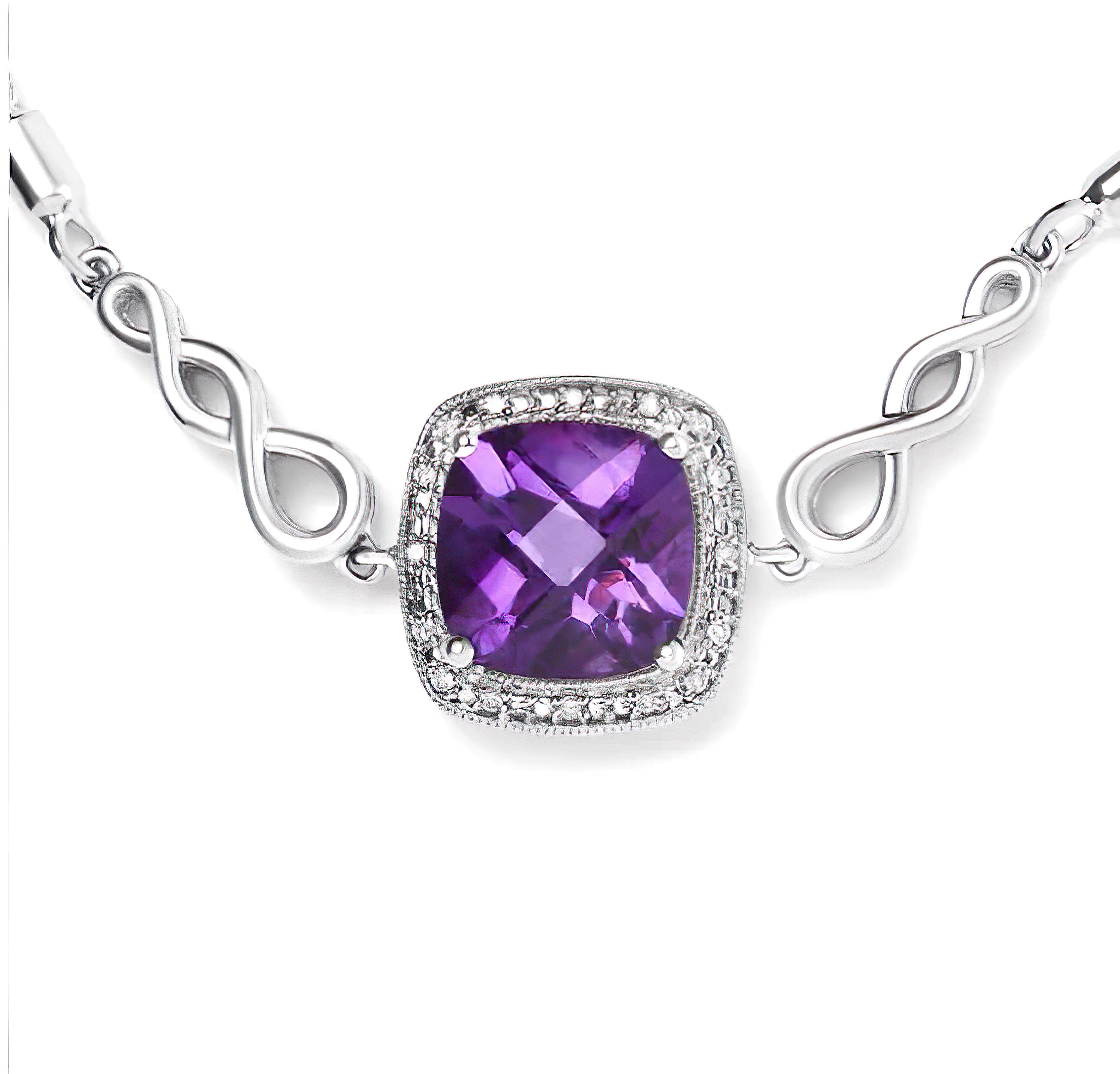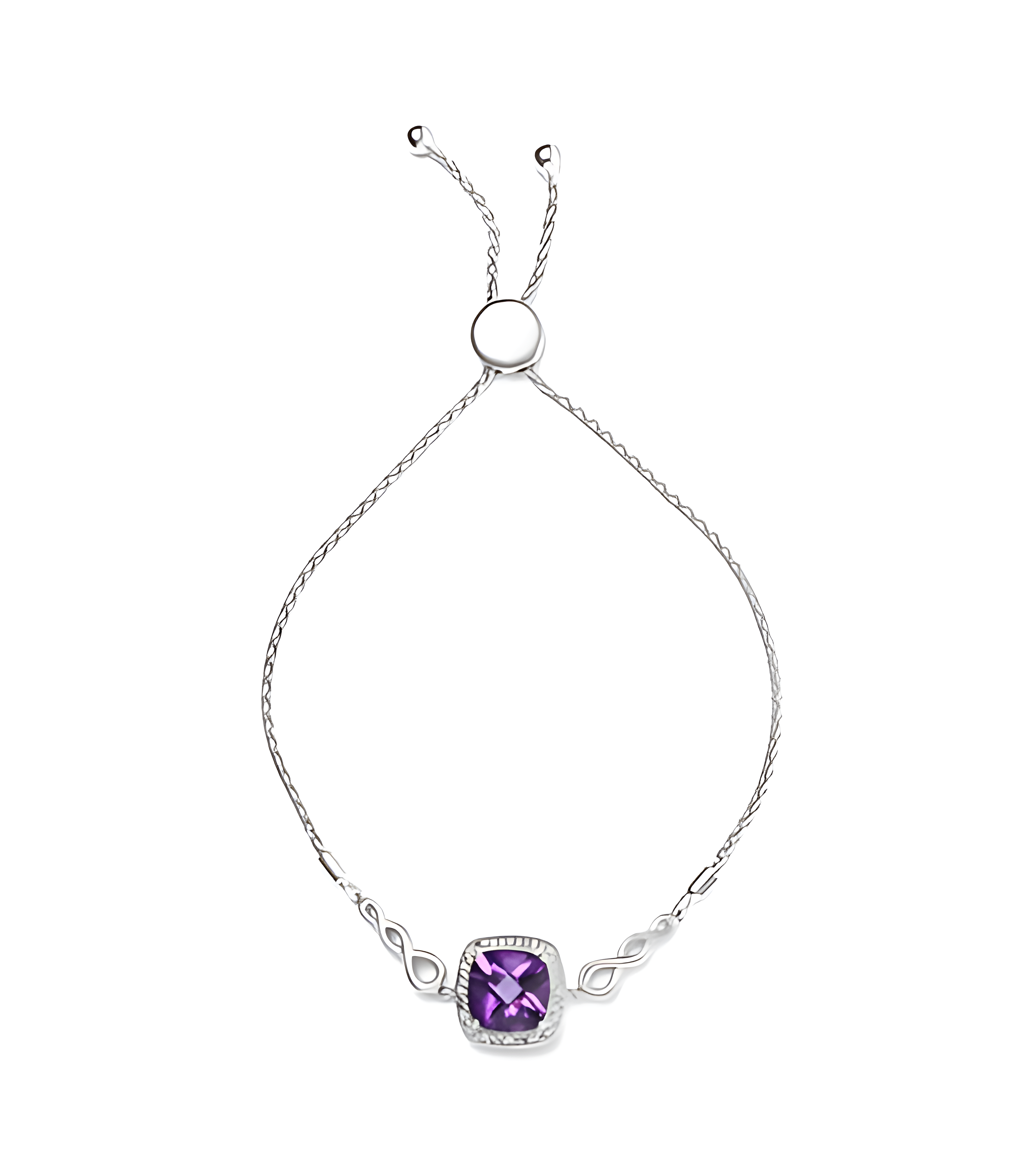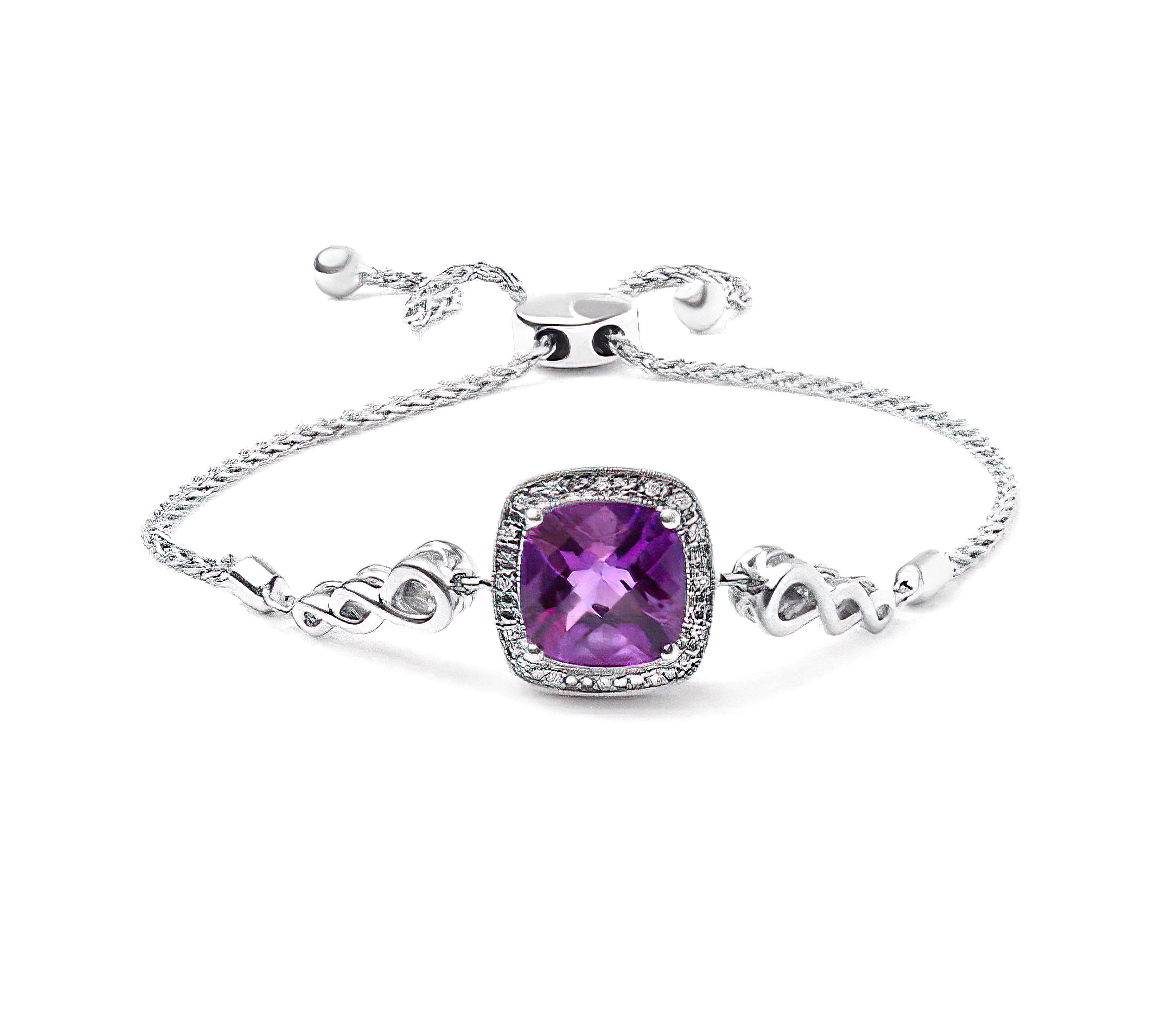 Indulge in the luxury of this exquisite lariat bracelet that captures the essence of elegance and sophistication. The centerpiece of this stunning bracelet is a gorgeous 10mm cushion-cut amethyst gemstone that adds a pop of regal purple color to your outfit. Sparkling round-cut diamonds, totaling 0.05 cttw, delicately encircle the amethyst gemstone, adding a touch of glitz and glamour. The adjustable bolo chain features a unique lariat design that allows you to adjust the length of the bracelet, ensuring a perfect fit for your wrist. This versatile bracelet is crafted from .925 sterling silver and finished with a sleek bolo clasp, making it an excellent addition to any jewelry collection. Treat yourself or a loved one to this charming amethyst and diamond accent lariat bolo bracelet, perfect for any occasion.