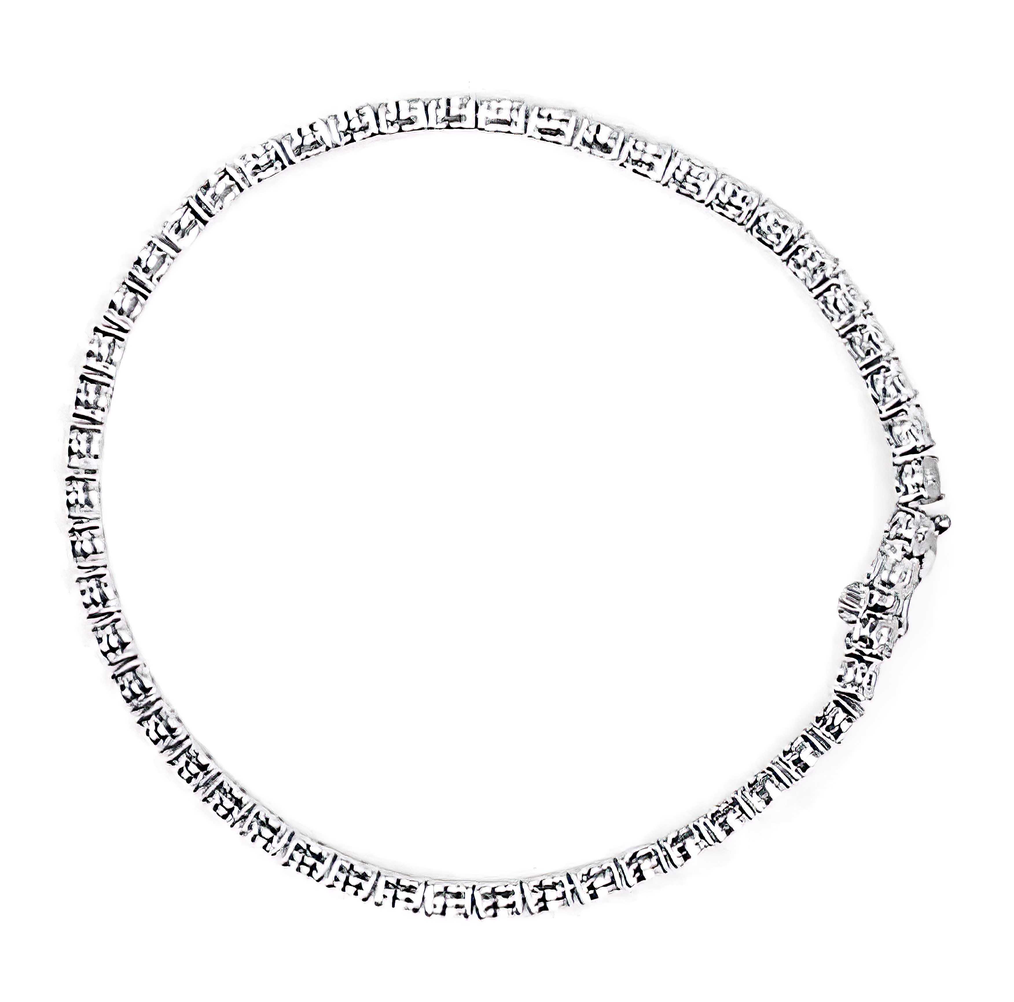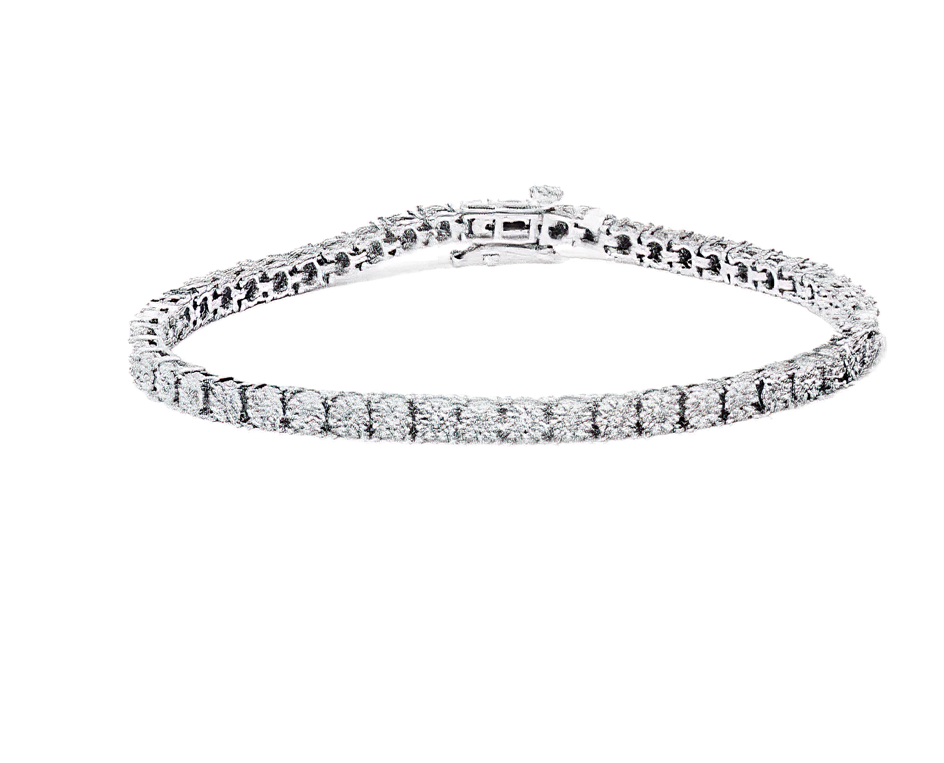 Elegant and timeless, this gorgeous 92.5% sterling silver tennis bracelet features 2.0 carat total weight of natural round brilliant cut white diamonds with a whopping 78 individual stones in all. The tennis bracelet has hinged links consisting of two prong set diamonds each. The 7.25” long bracelet culminates in a secure box with tongue and safety clasp. Whether worn for daytime glamour or evening sparkle, this classic tennis bracelet is gorgeously versatile. It’s a timeless treasure she’ll enjoy wearing every day. This classic tennis bracelet makes a great gift for any special occasion, as well as a great gift for those with April birthdays! Diamonds are thought to give the wearer clarity and illuminate solutions to life’s problems, as well as encouraging abundance, strength, courage, harmony, faithfulness, and commitment. Give her a gift that will perfectly complement her favorite ensemble.