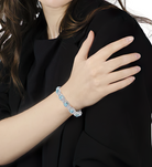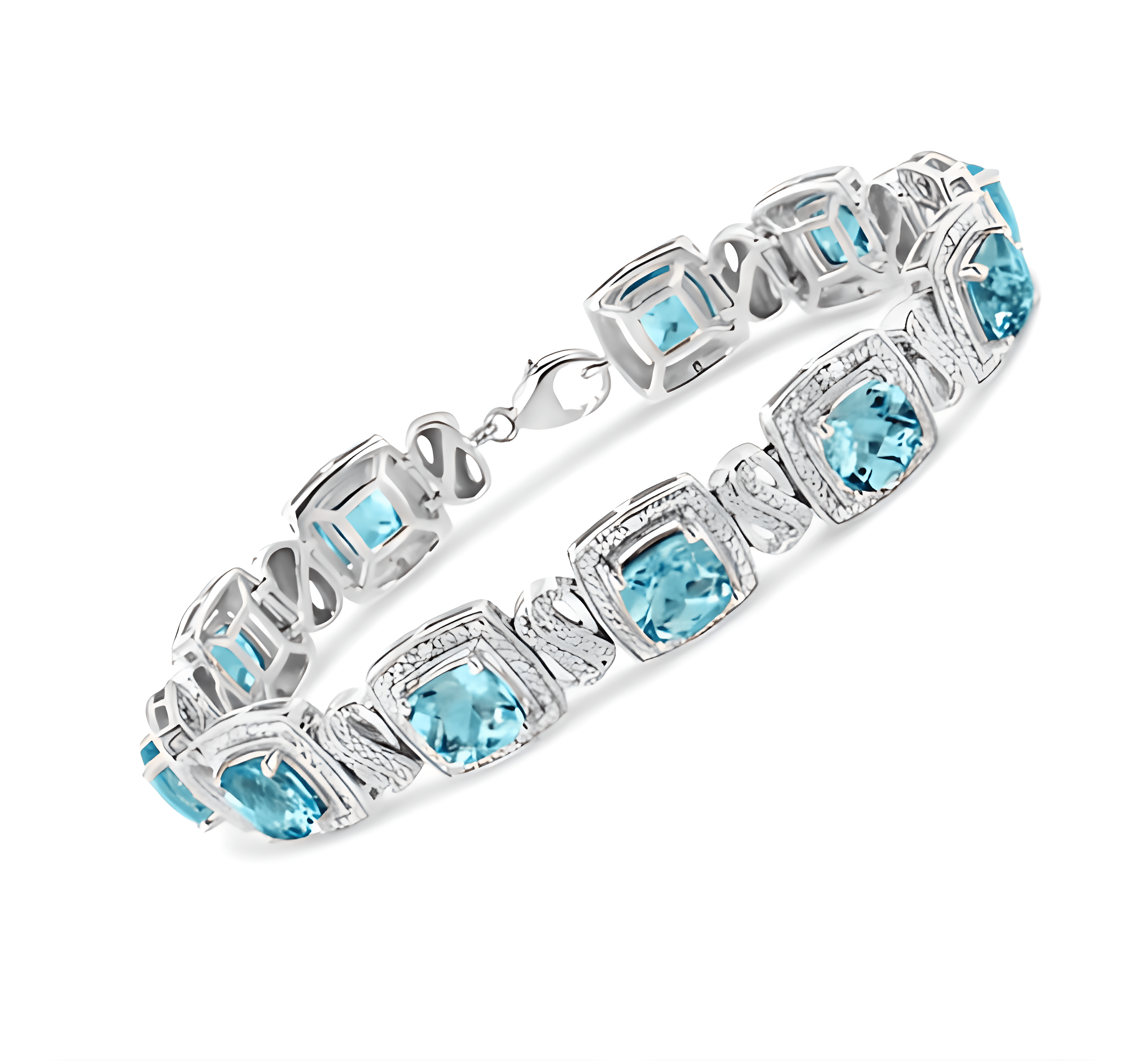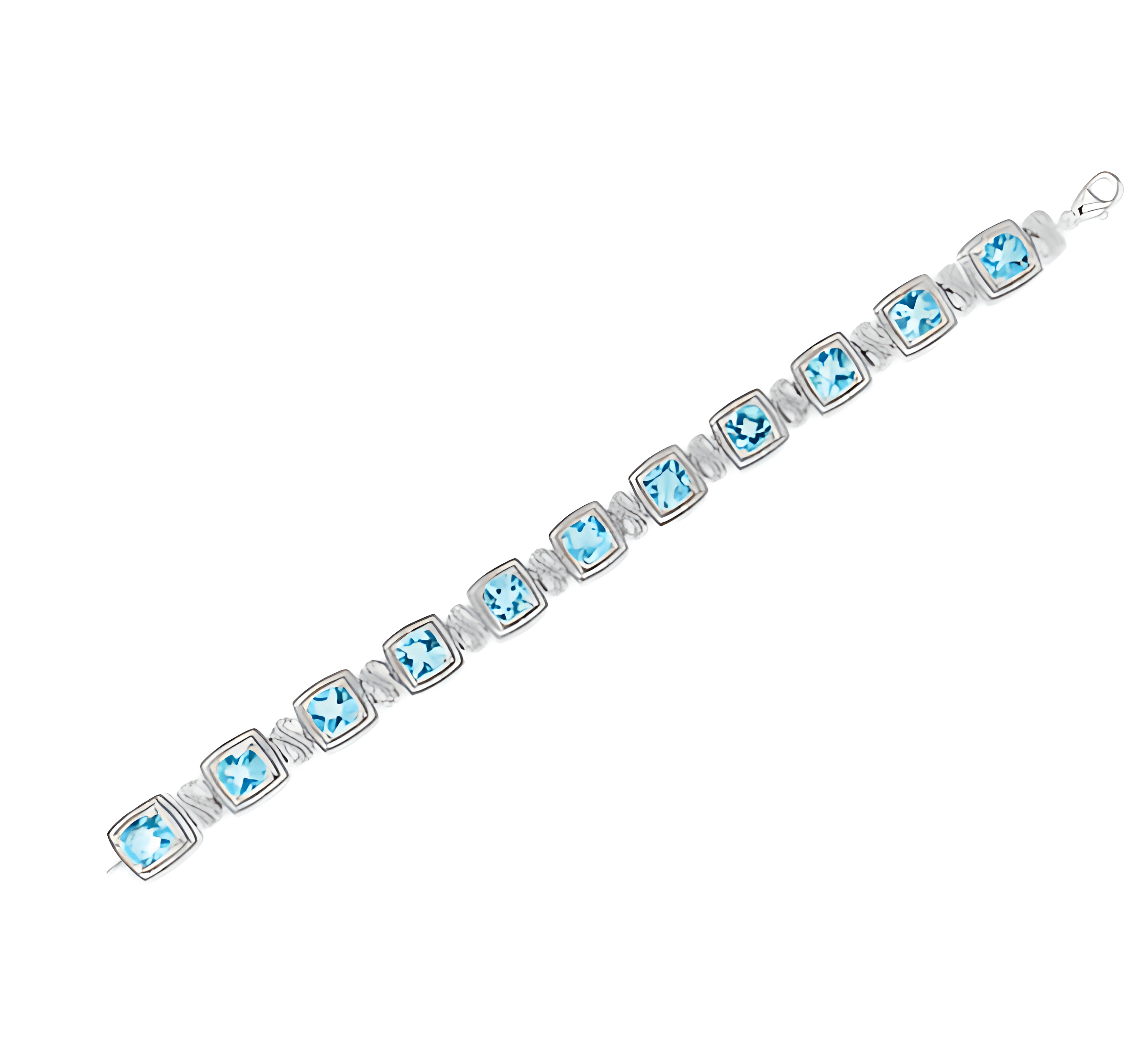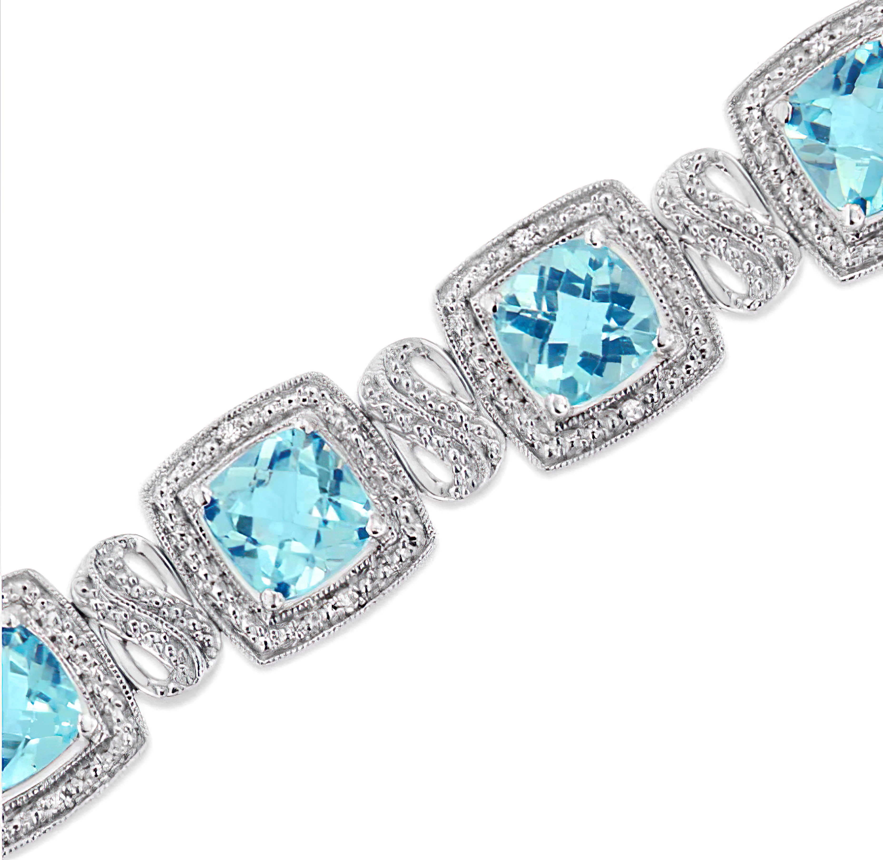 Elevate your sweetheart's style with our dazzling Blue Topaz and Diamond Bracelet, a true testament to love and elegance. Crafted in exquisite sterling silver, this bracelet boasts a striking square design adorned with 11 captivating prong-set cushion-cut blue topaz gemstones.