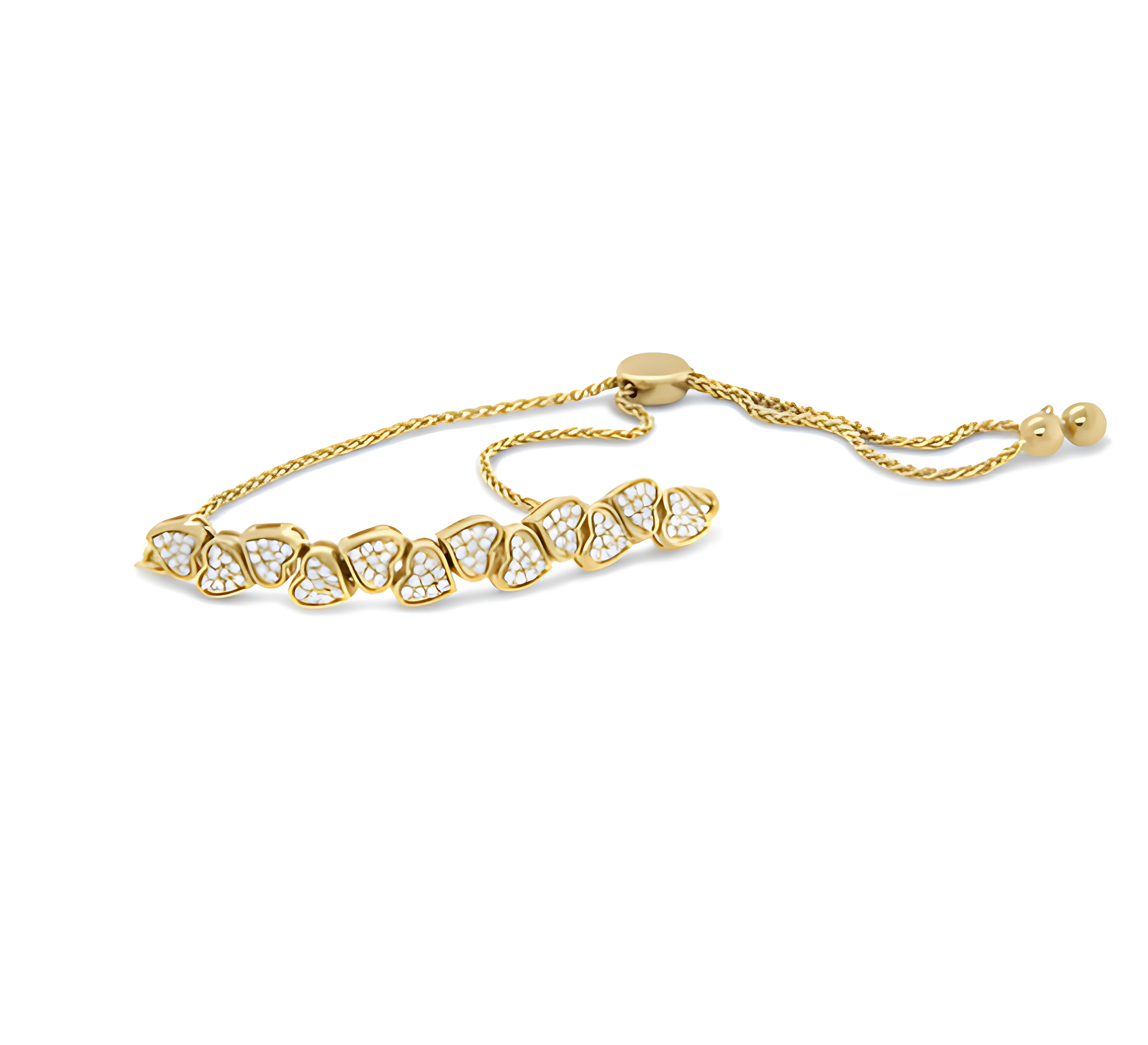 Indulge in the epitome of feminine elegance with this enchanting bolo bracelet that promises to capture hearts and spark admiration wherever you go. Crafted from lustrous yellow-plated .925 sterling silver, it boasts a mesmerizing row of sideways heart silhouettes adorned with clusters of dazzling round diamonds, totaling an impressive 1/2 carat total weight. Each delicate diamond, elegantly pave-set, exudes brilliance with an approximate H-I Color and I1-I2 Clarity, ensuring a captivating sparkle that enchants the eye.