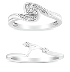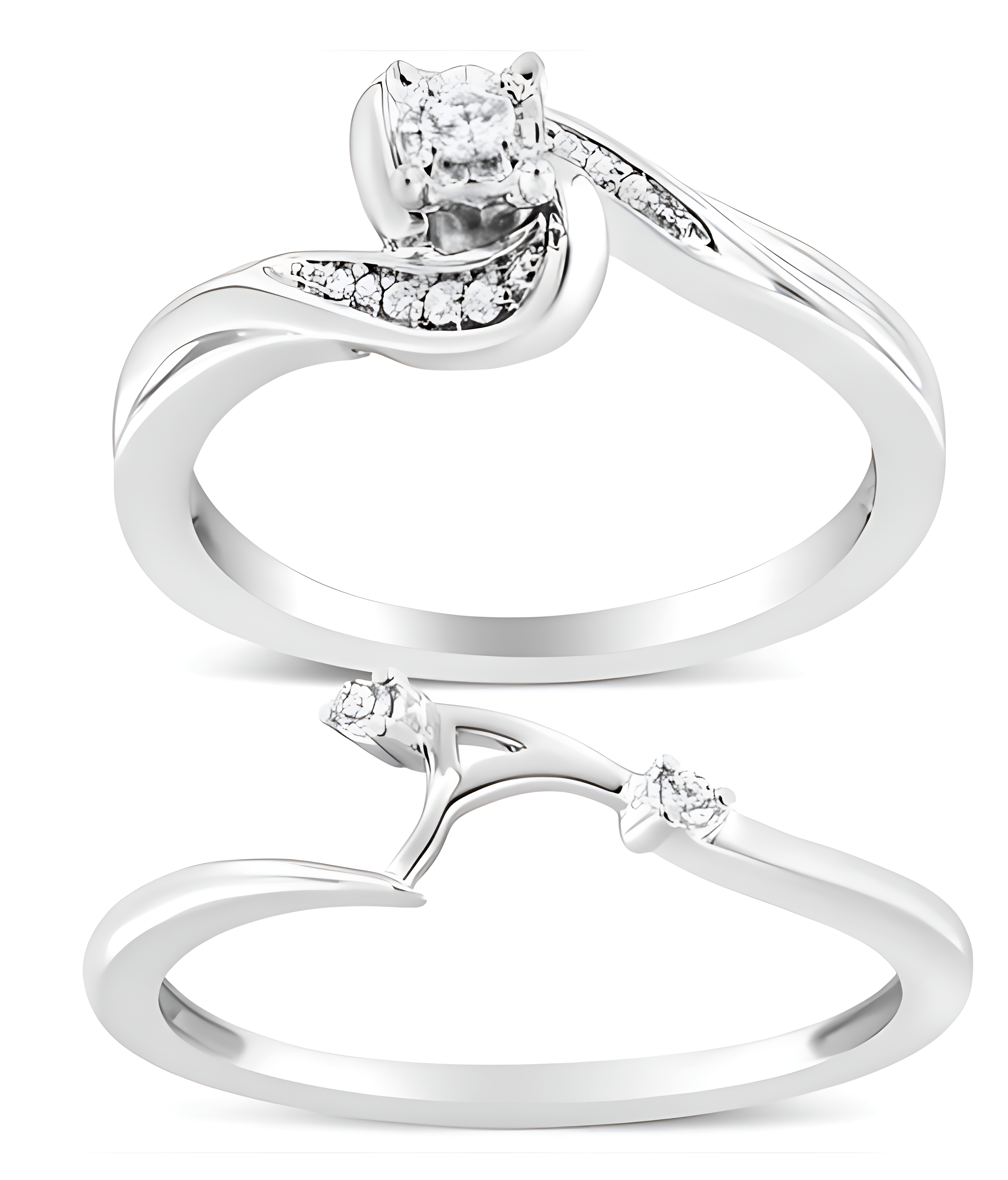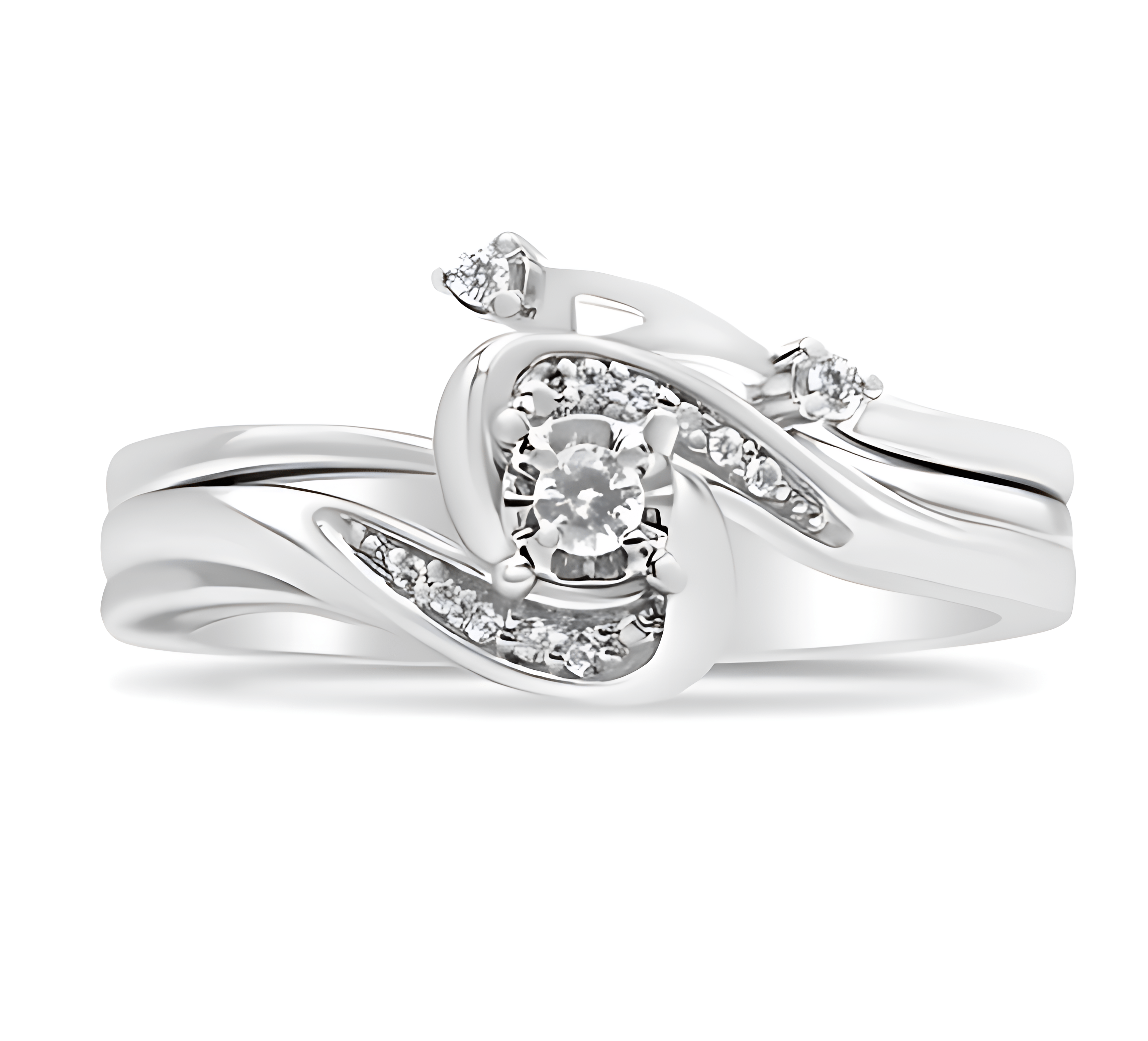 Indulge in the mesmerizing allure of this .925 Sterling Silver Bridal Set Ring and Band. Crafted with utmost precision, this Elegant Collection piece showcases a captivating swirl and bypass design, symbolizing eternal love and commitment. Adorned with 13 round-cut diamonds, totaling 1/10 cttw, the shimmering I-J color diamonds effortlessly enhance your natural beauty. Set in a prong setting, these natural diamonds exude a radiant glow. With its exquisite craftsmanship and I3 clarity, this stunning piece is tailored for the discerning woman who seeks both elegance and sophistication. Elevate your style and make a statement with this enchanting bridal set.