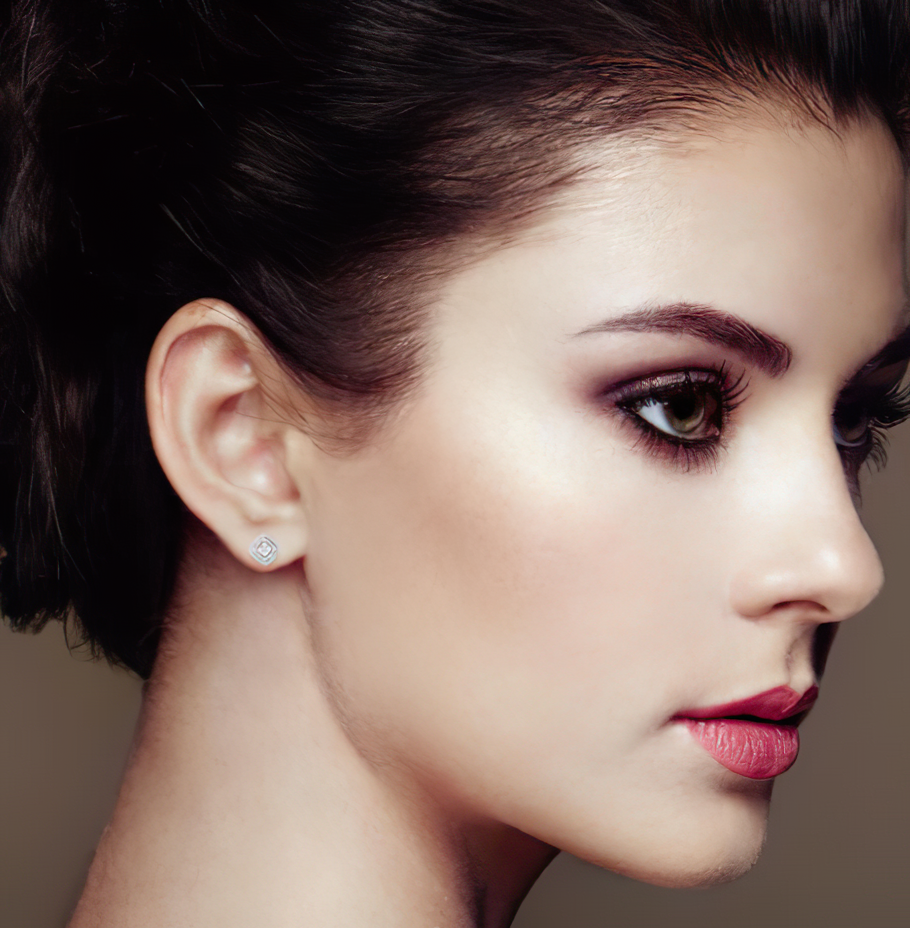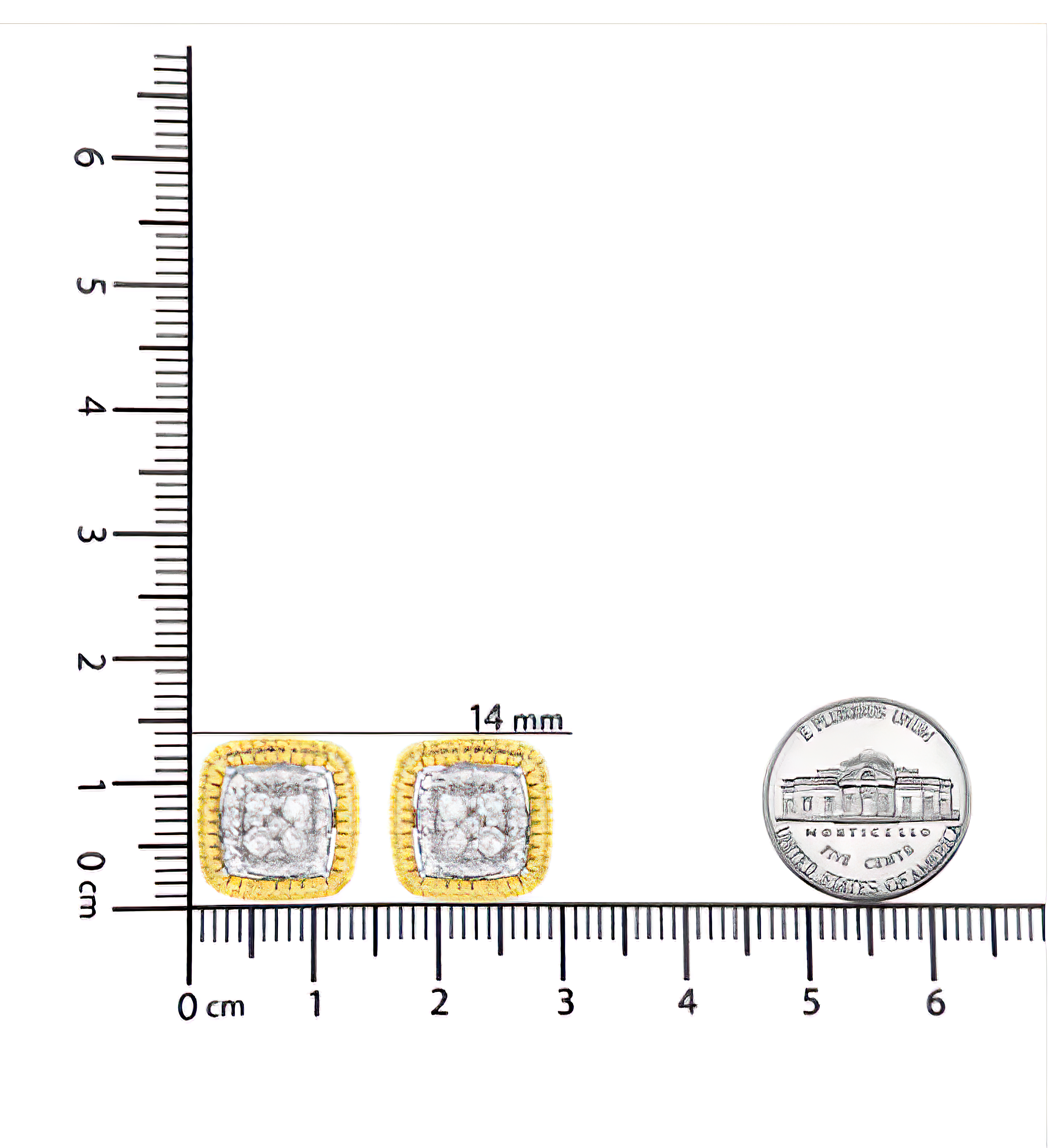 Inspired by timeless elegance and radiant beauty, these exquisite stud earrings offer a design that epitomizes sophistication. Each earring features a stunning diamond motif encased in double yellow gold beaded halos that float gracefully. The round-cut diamonds are meticulously arranged in a square formation and are beautifully framed by a delicate beaded silver ribbon.