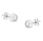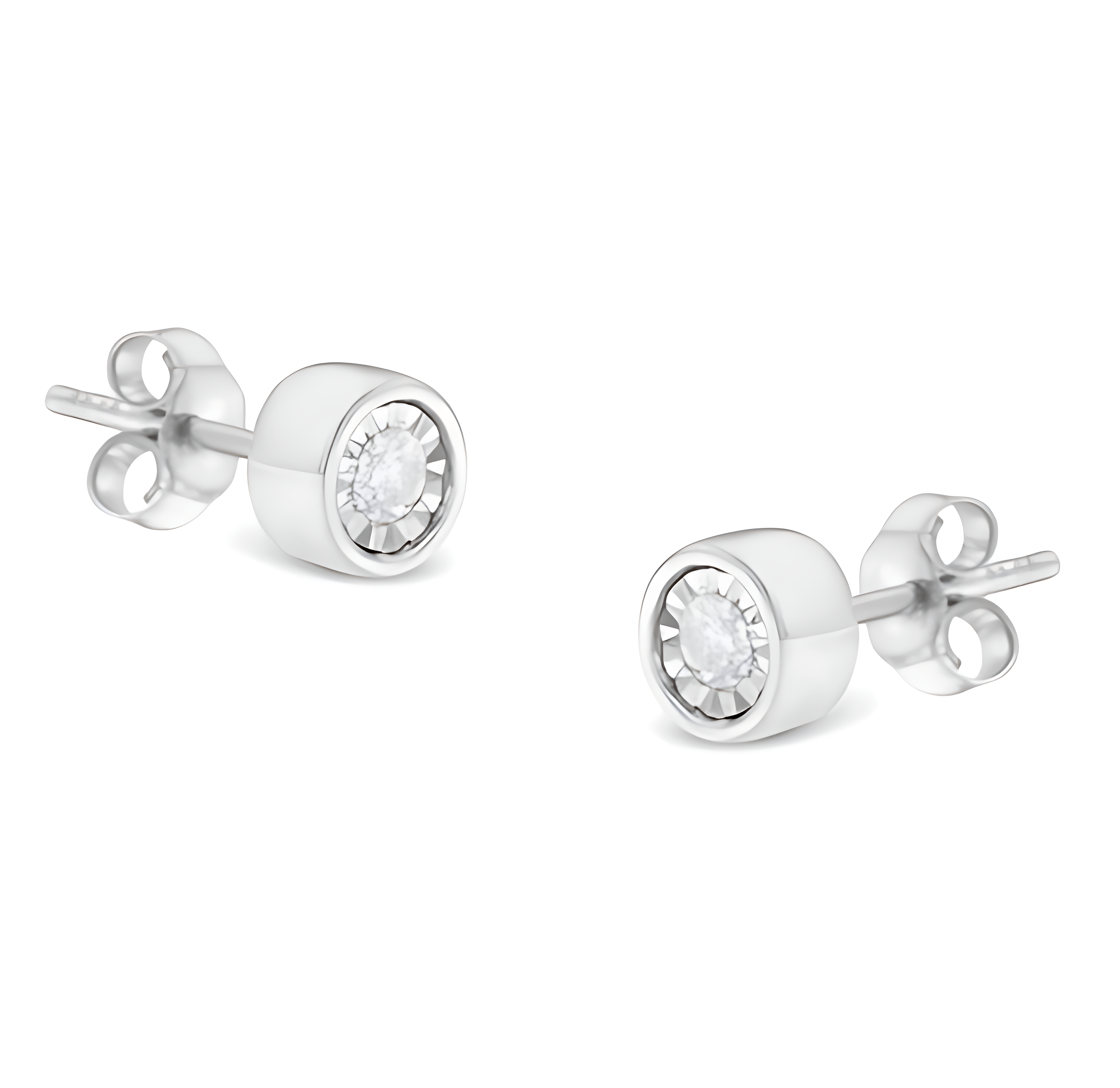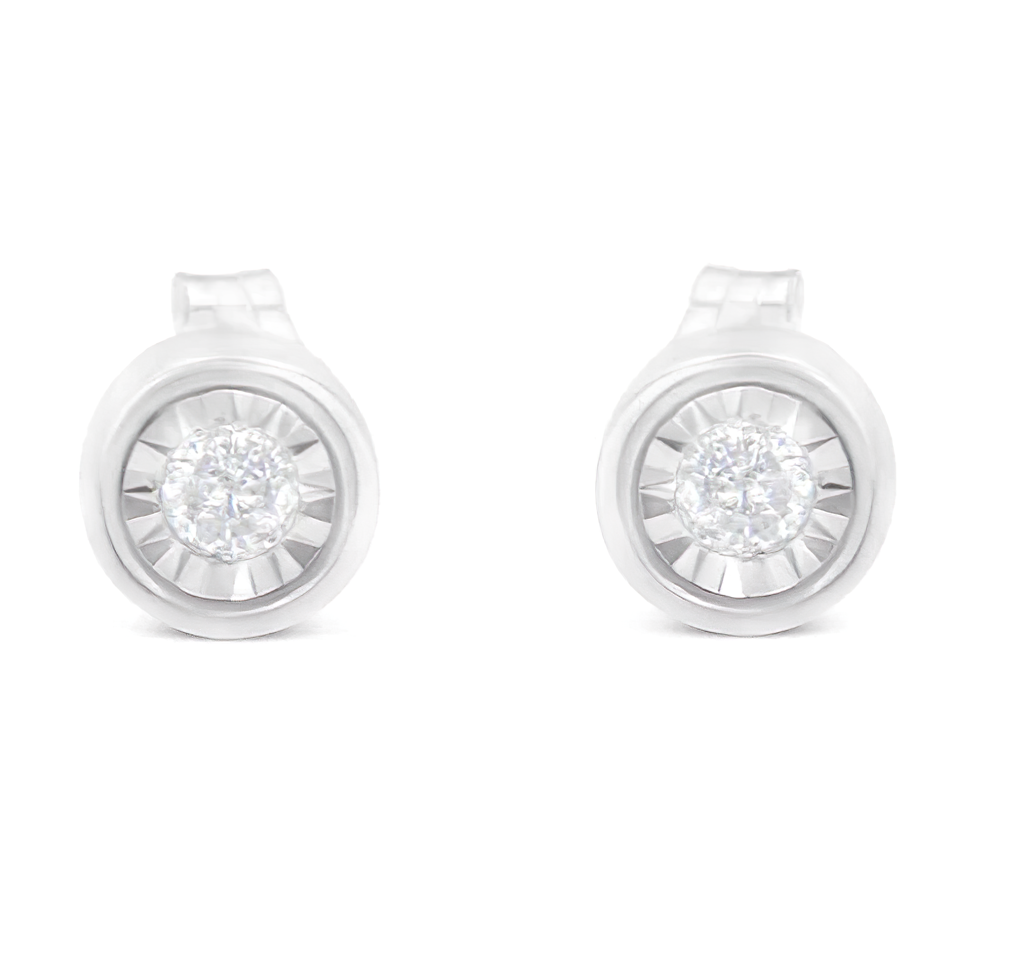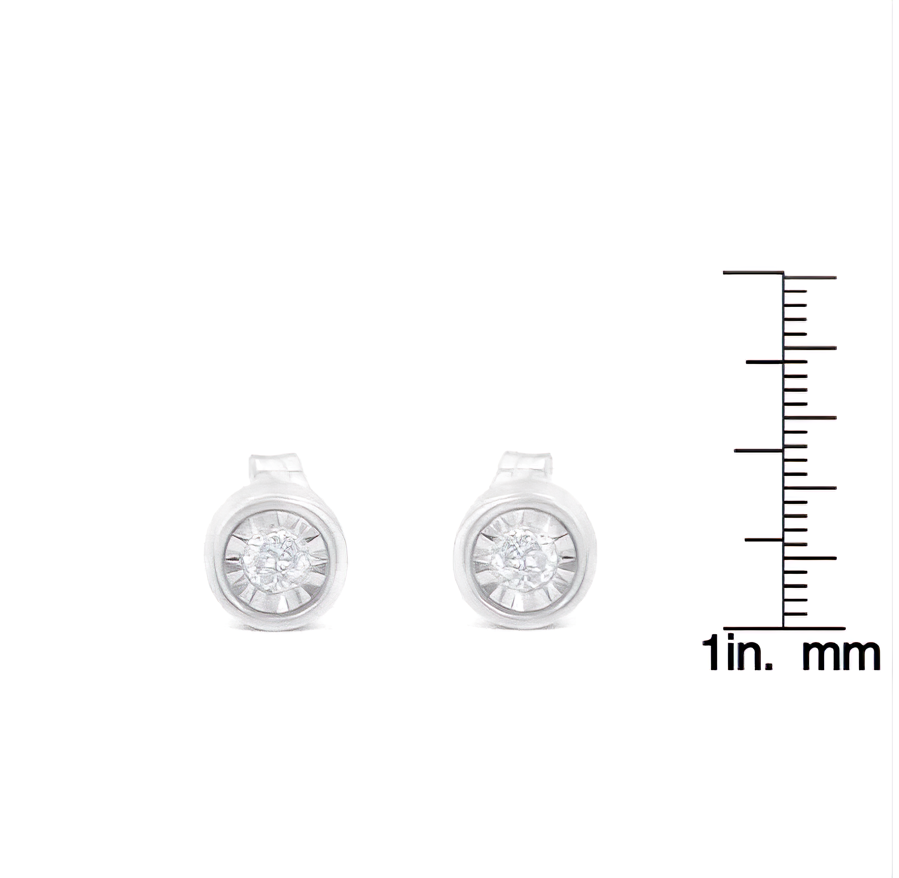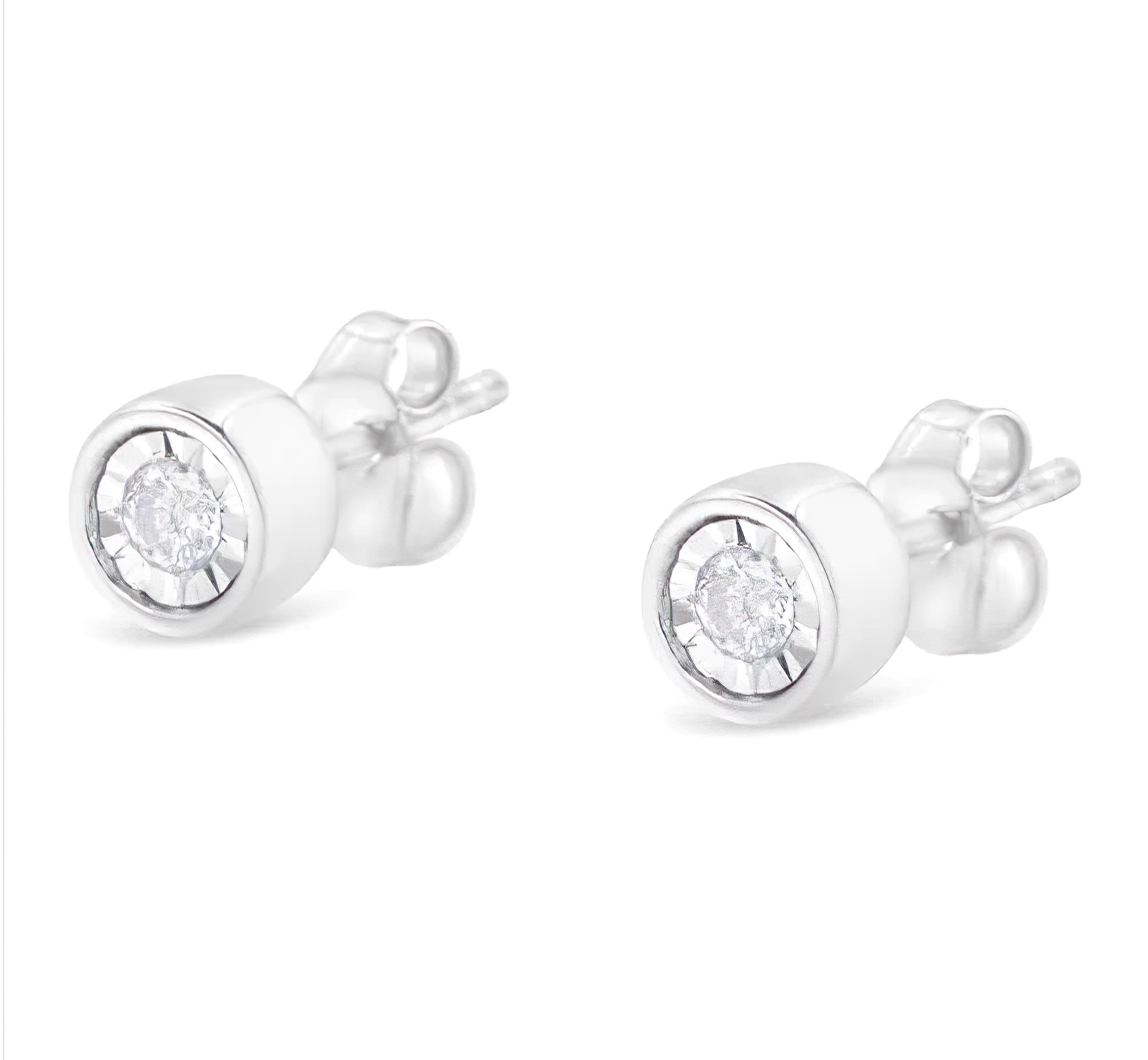 Frame her face with the bold and impressive look of these stunning diamond bezel stud earrings. Crafted in sterling silver, each earring features a mesmerizing 0.10 carat round brilliant-cut diamond in a fluted, miracle-style setting, nestled within sleek, modern barrel bezels. With a total of 0.20 carats of diamonds, these earrings captivate with their sparkle and a brilliant buffed luster. Secured comfortably with post backs, these earrings are perfect for any outfit and are a timeless investment piece.