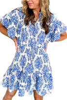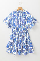 It features a standup collar with ruffle details and lace up, smocked waist and ruffled hem