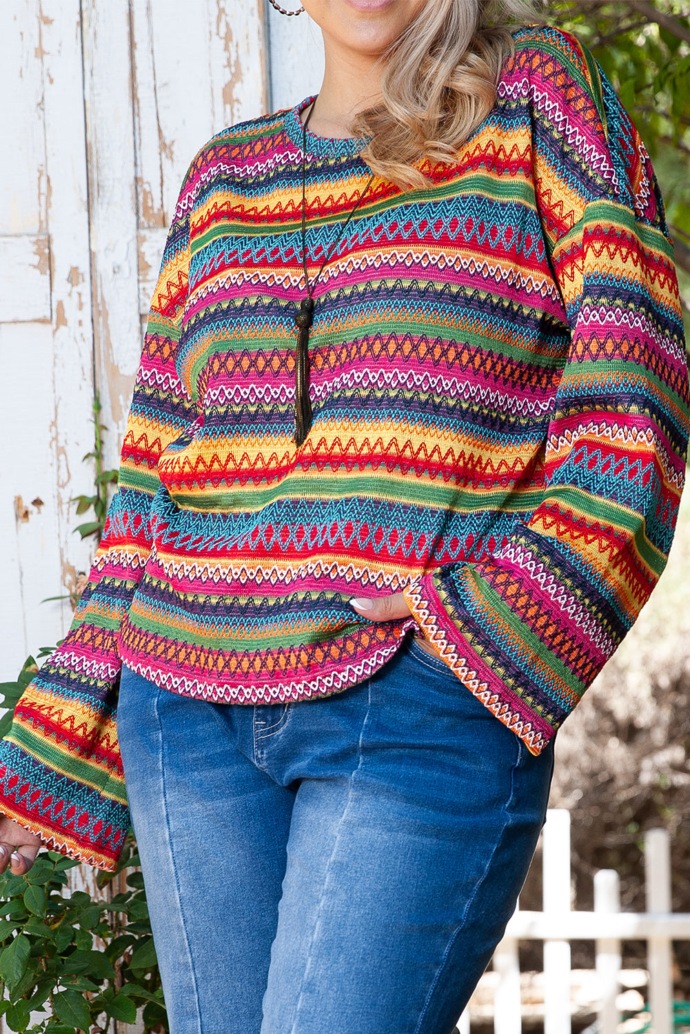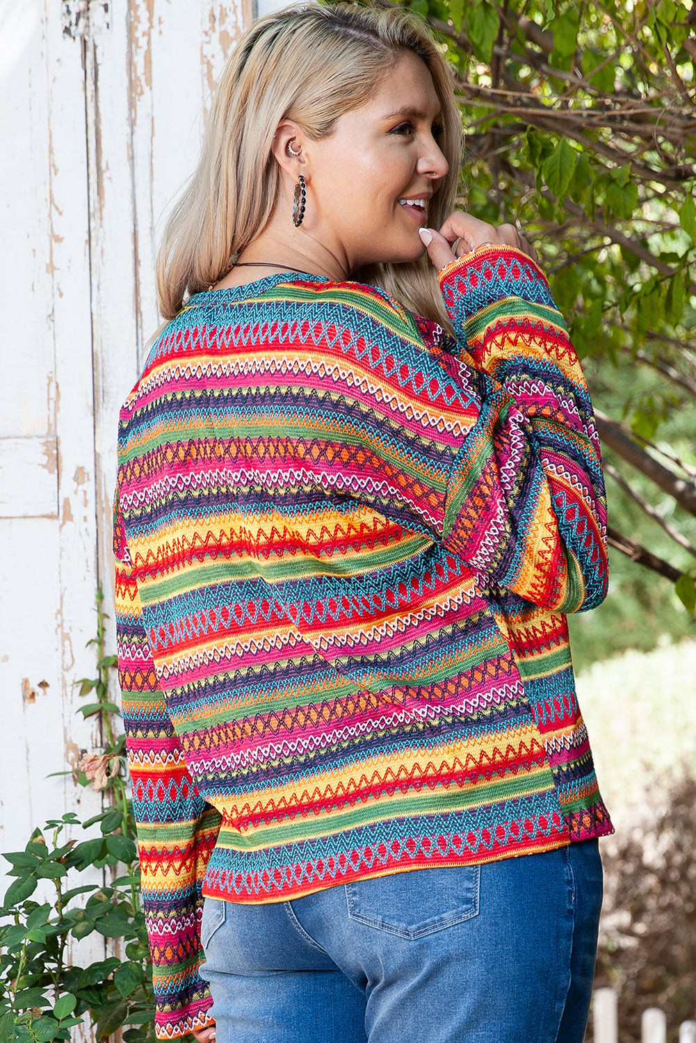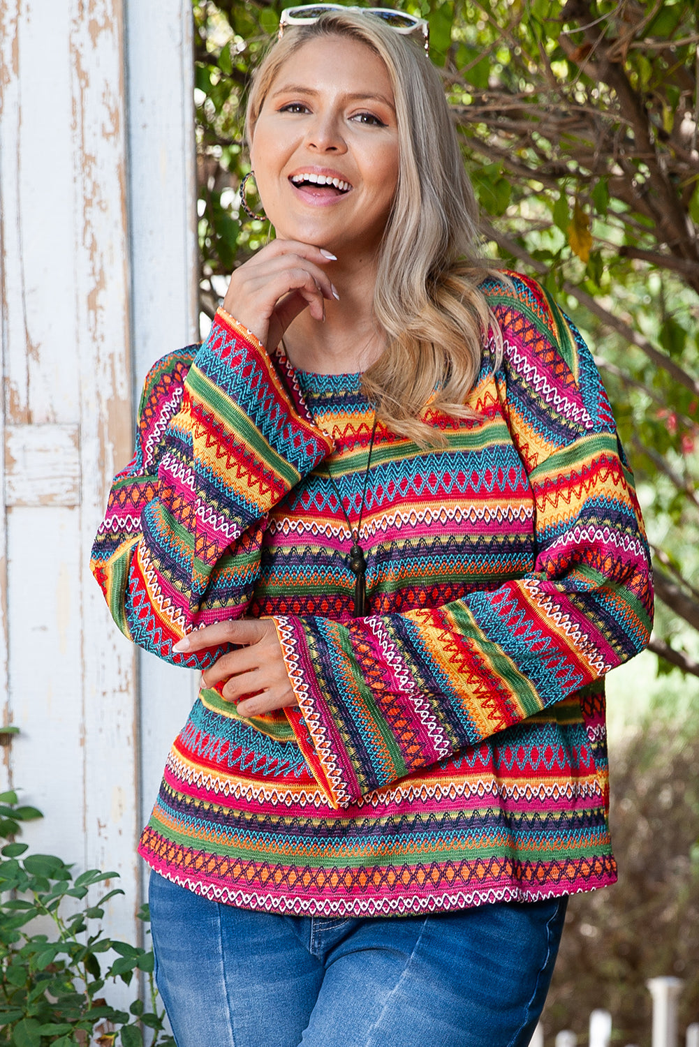 Red Ethnic Striped Print Long Sleeve Plus Size Top