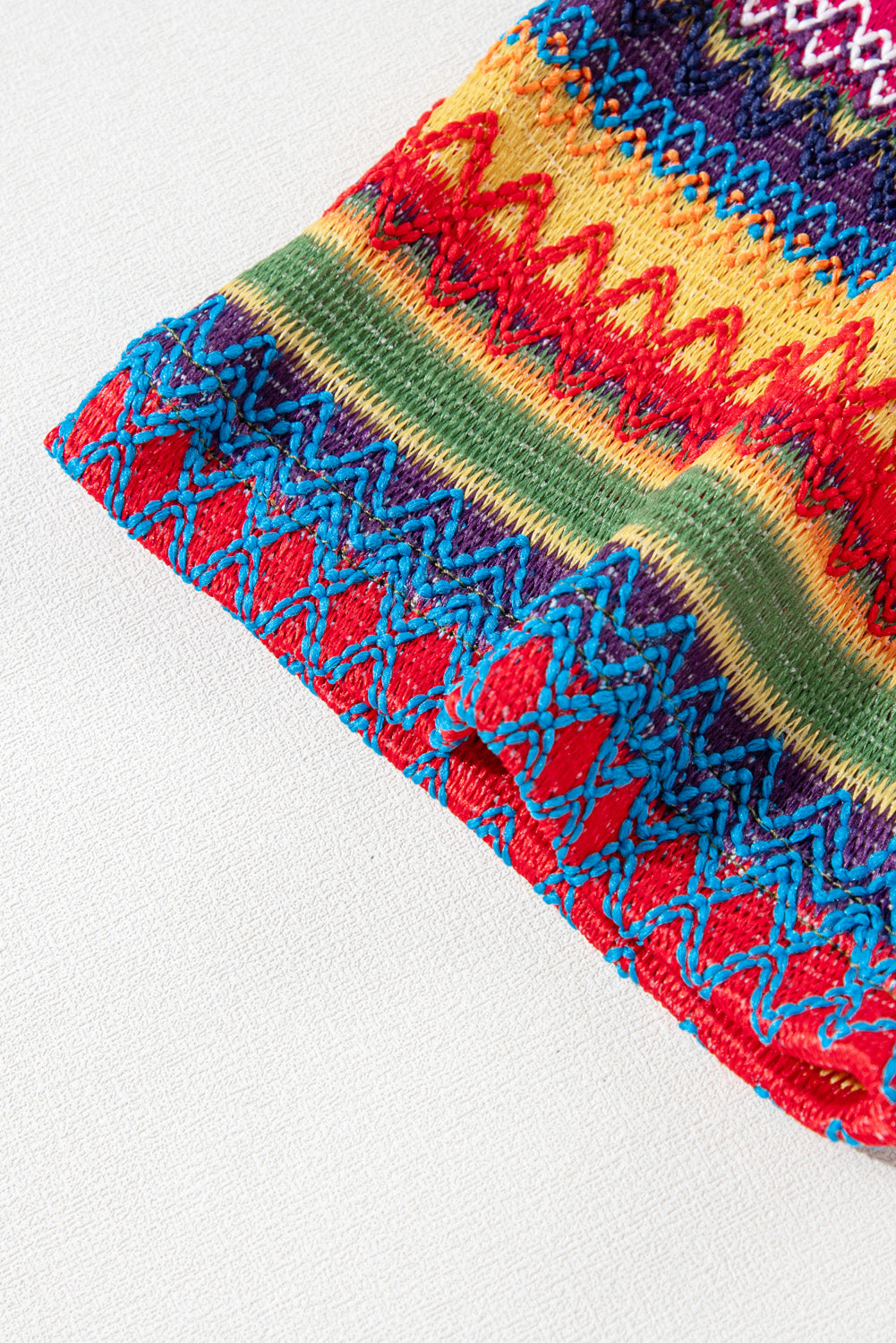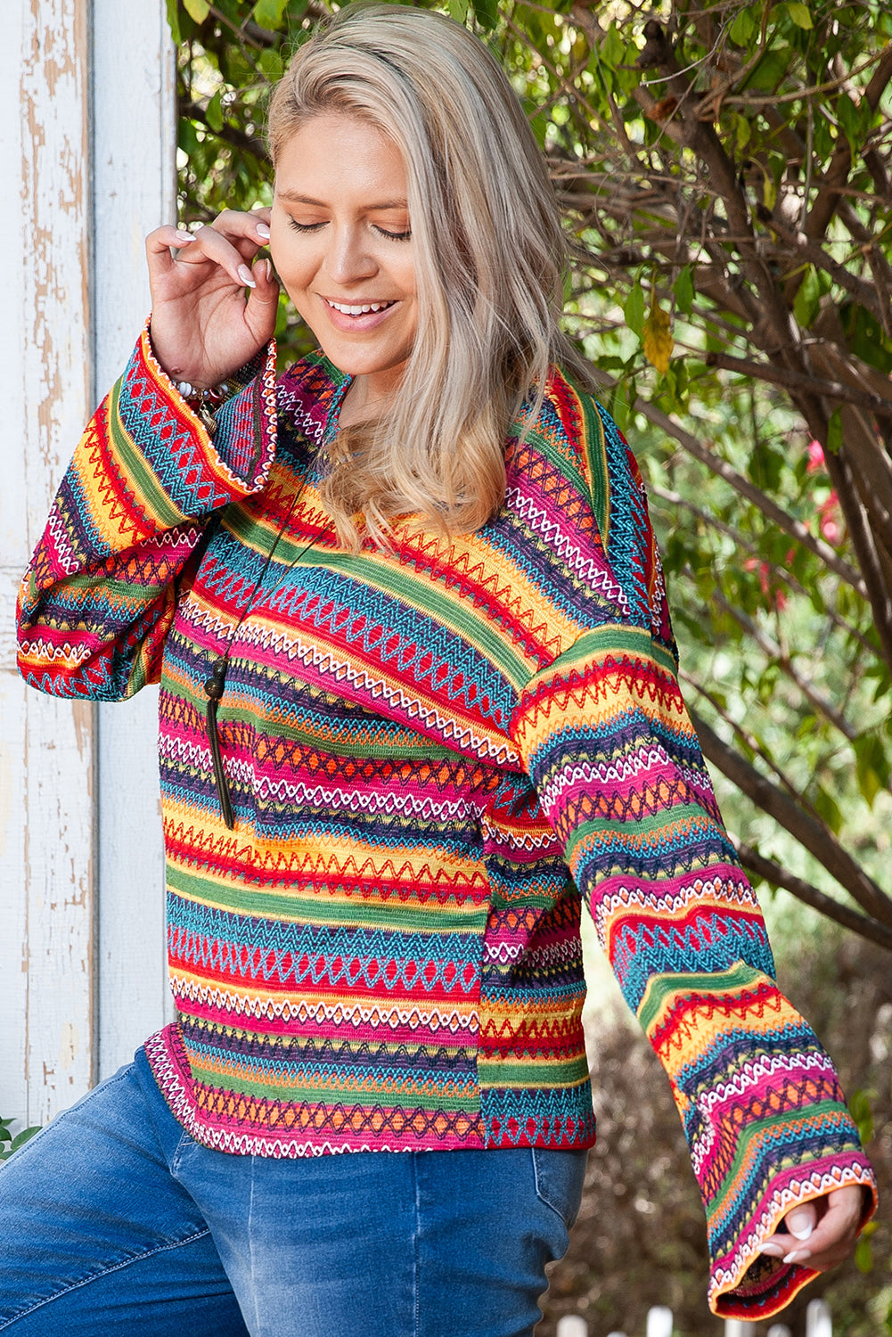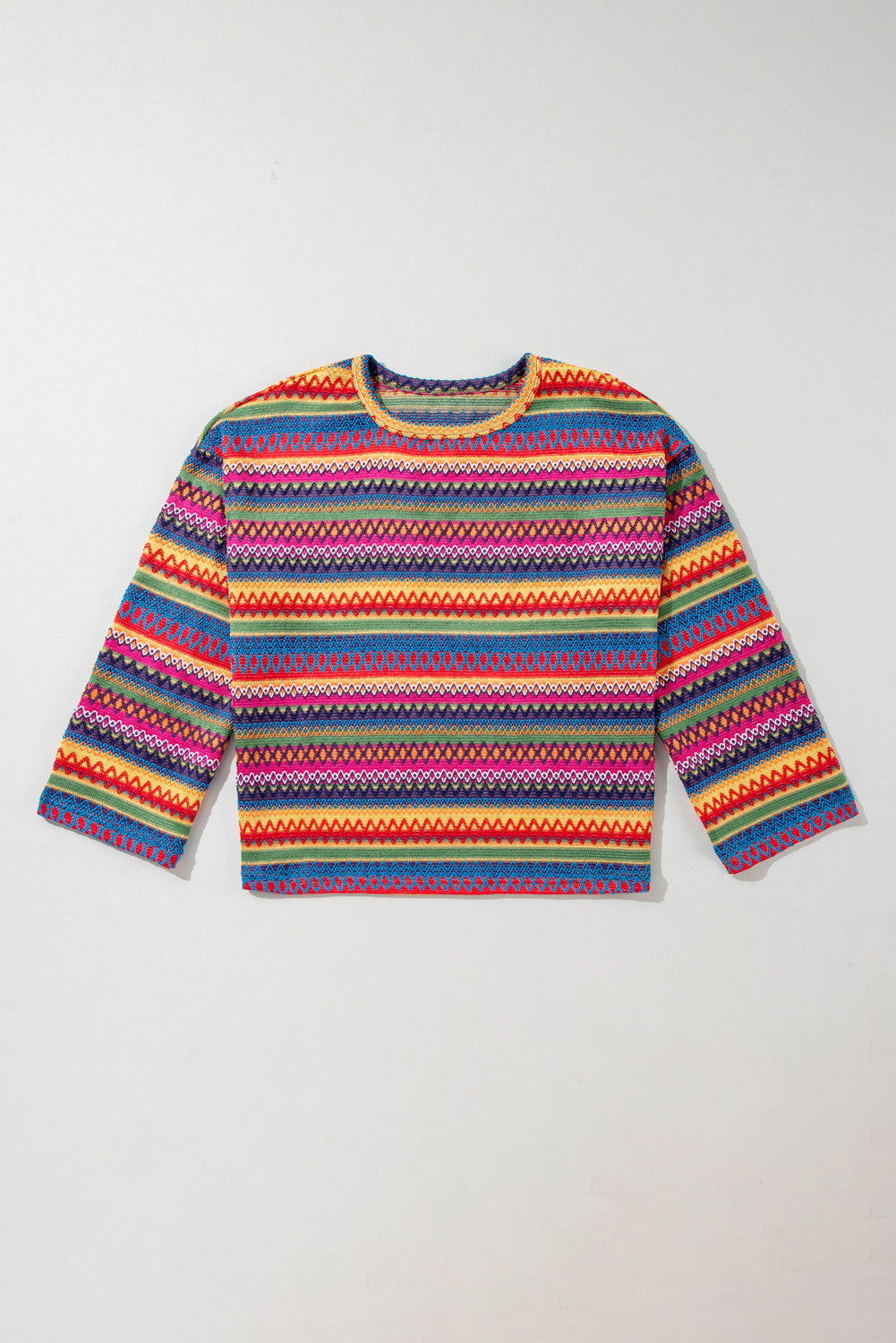 Red Ethnic Striped Print Long Sleeve Plus Size Top
